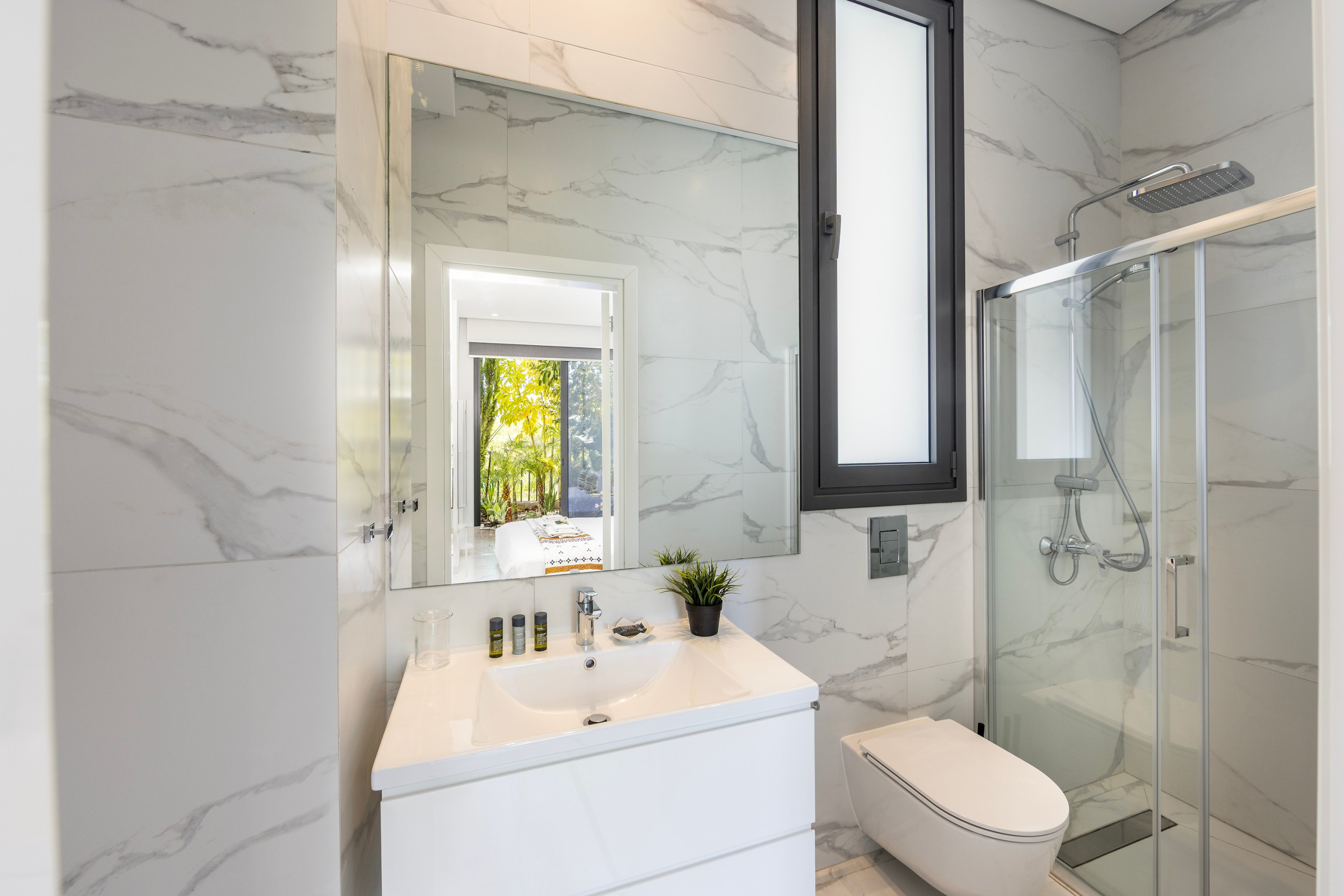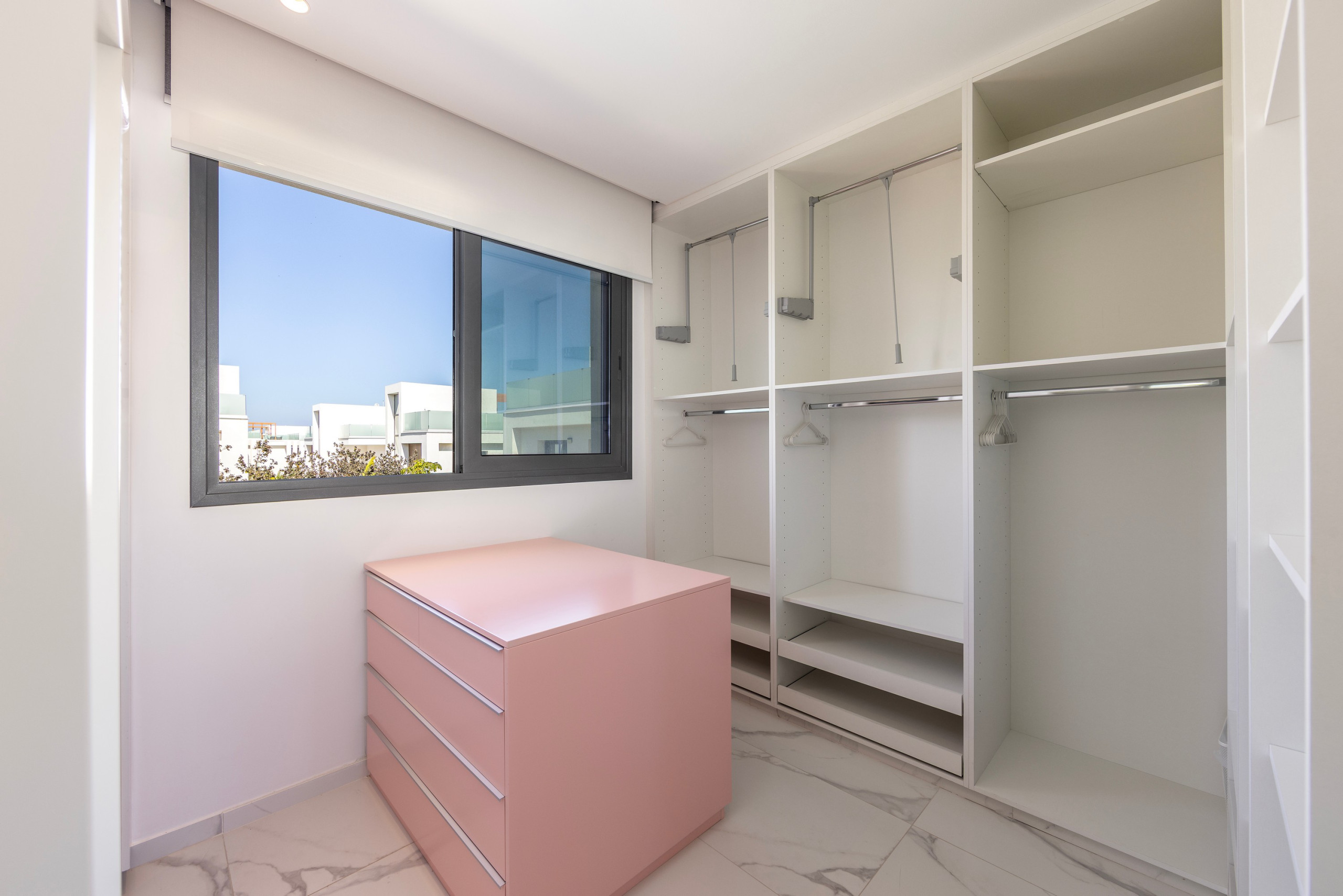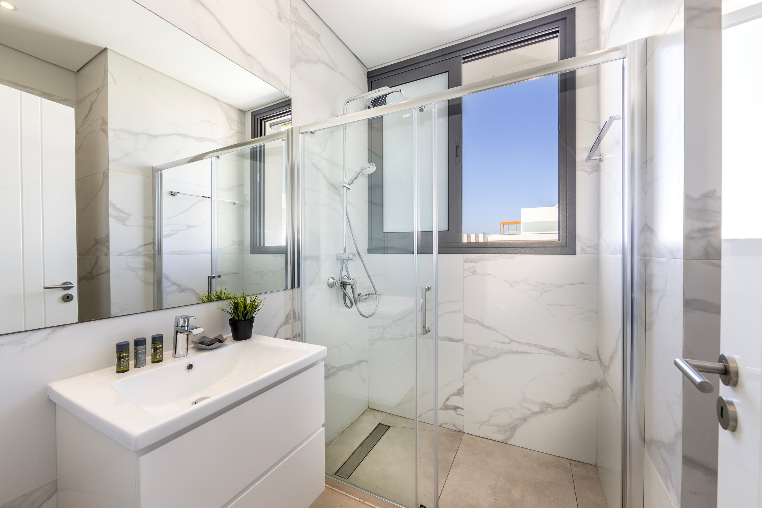 The upper floor features three en-suite bedrooms. The master bedroom offers en-suite shower room, a double bed and walk in closet, the second and third bedrooms also offer a double bed and en-suite showers. The washing machine is on the top floor landing before the exit to the roof terrace.