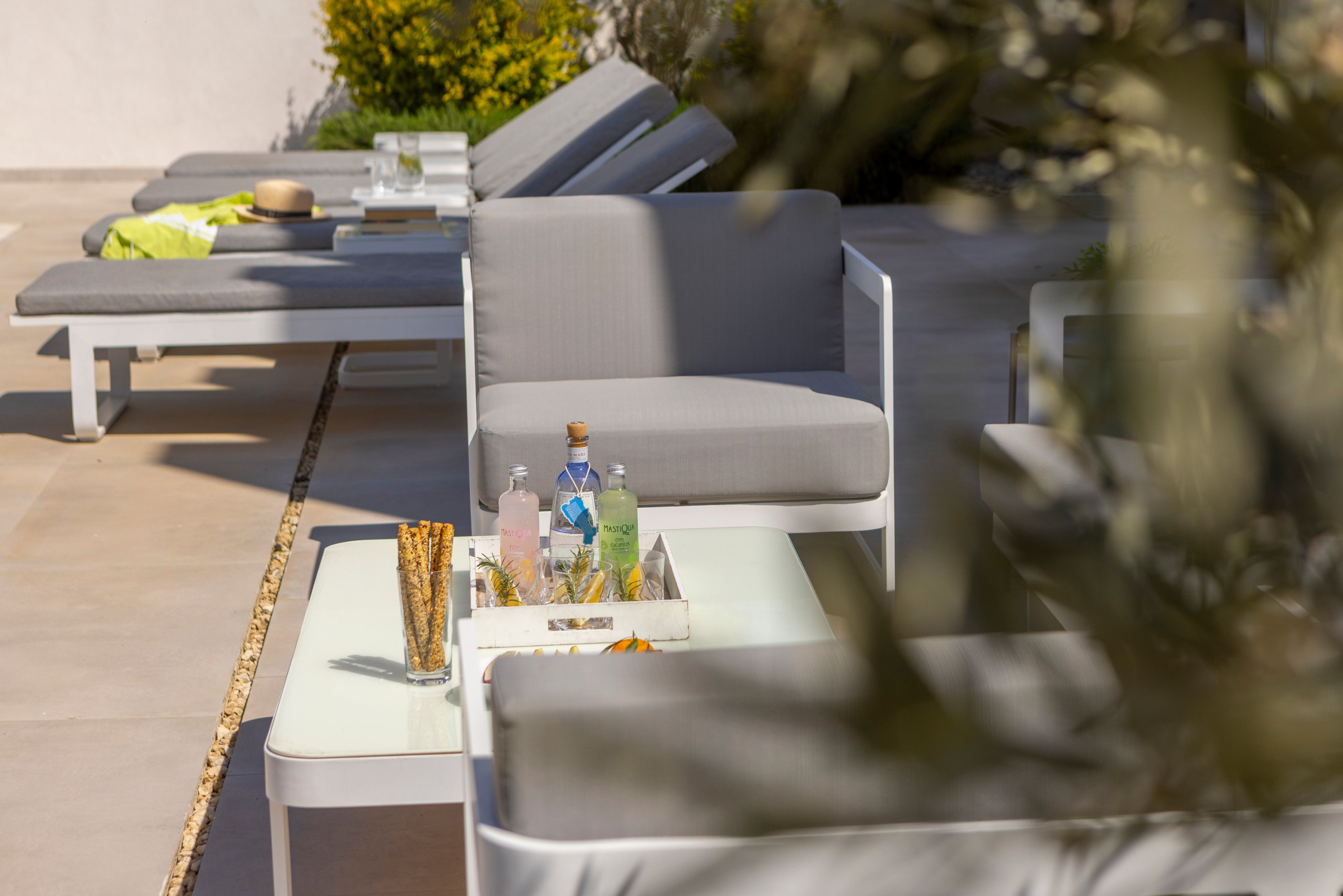 The pergola-covered roof terrace is accessible from the interior of the villa and offers a sitting area and distant sea views.