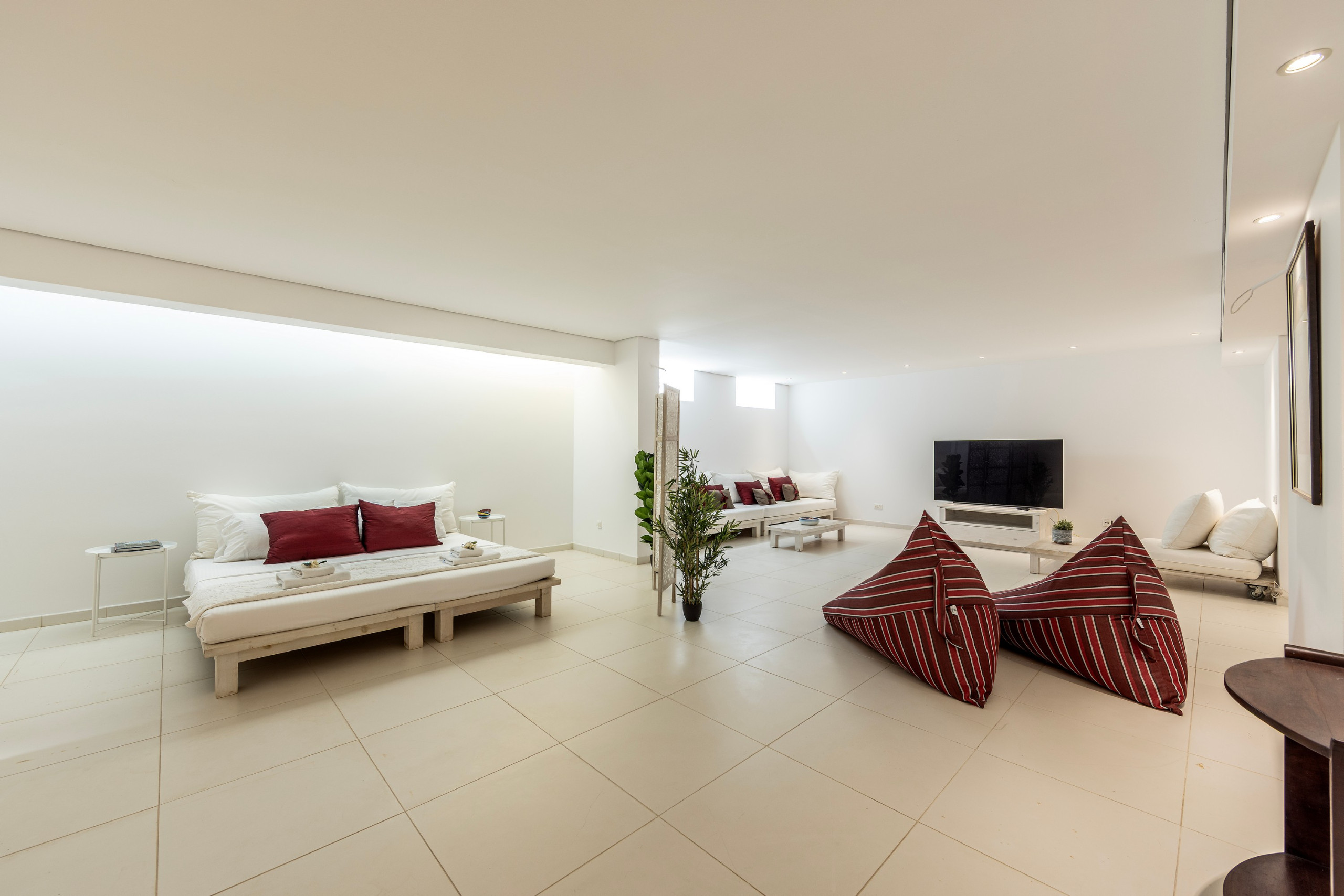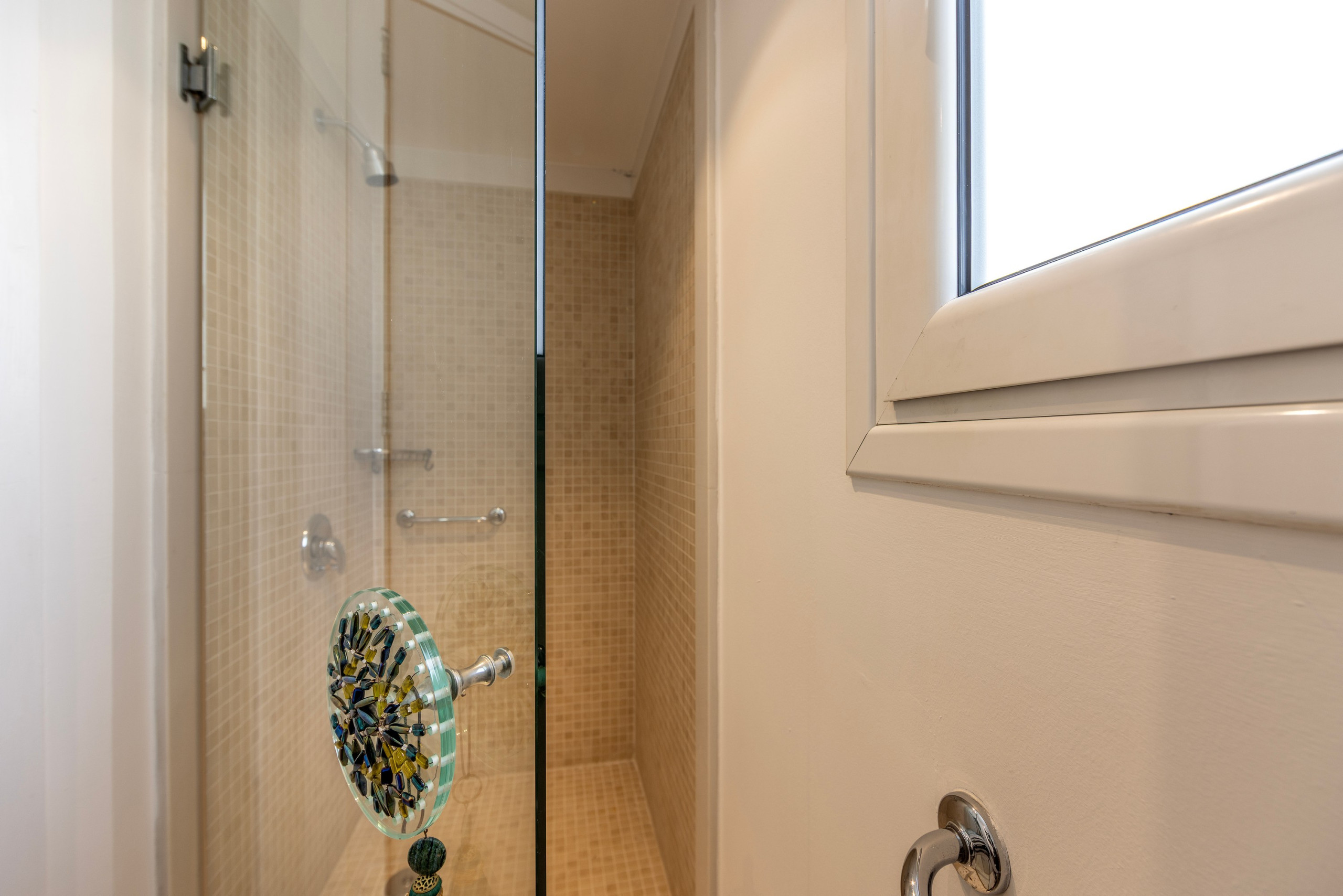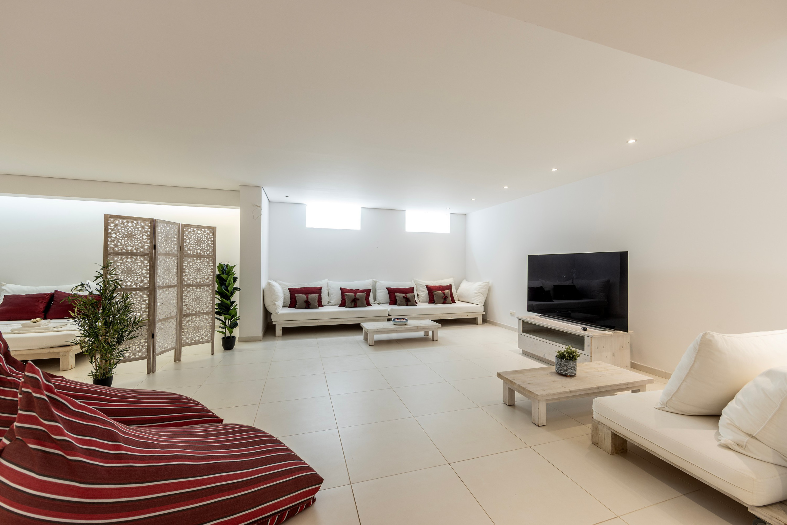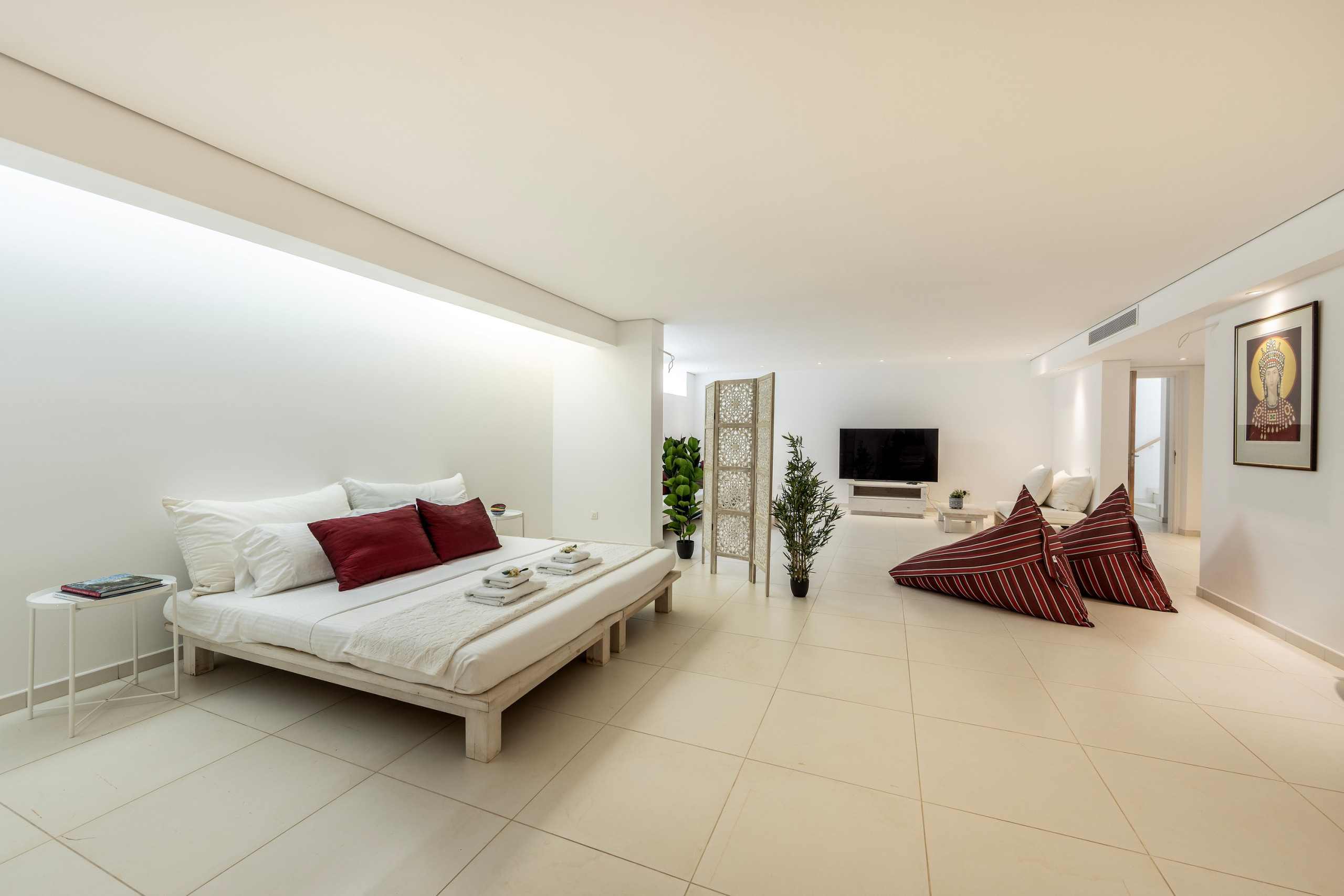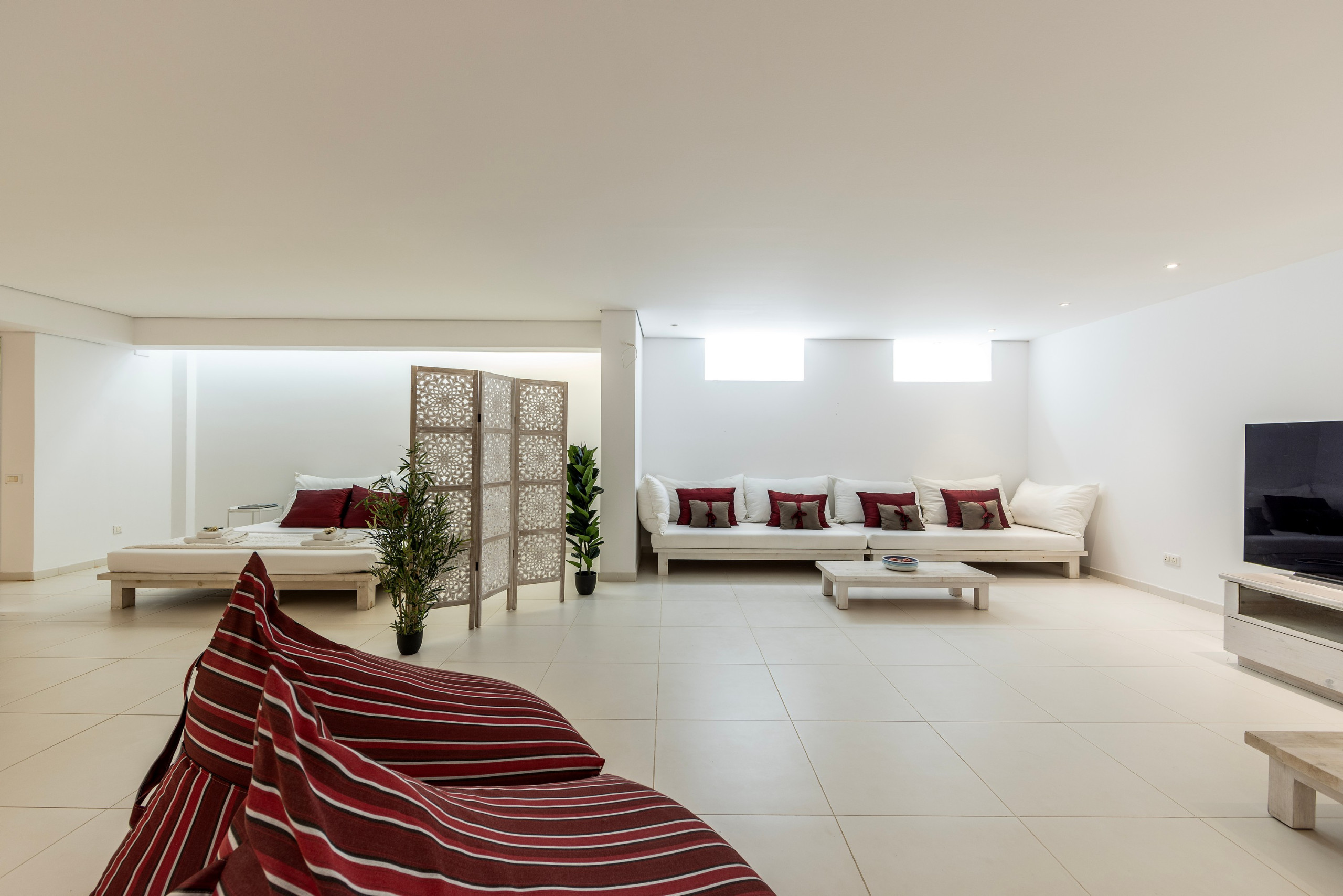 The villa boasts five beautifully appointed bedrooms, featuring a mix of king-size and individual beds, ensuring comfortable sleeping arrangements for all guests as well as five bathrooms. Three en-suite bedrooms with king-size beds are located on the upper floor. The fourth bedroom, with two large single beds, is on middle floor. If you open the indoor shutters, this room also serves as a second seating room overlooking the ground floor living room. The spacious basement floor serves as the fifth bedroom with a king-size bed, TV lounge, shower room and steam bath.