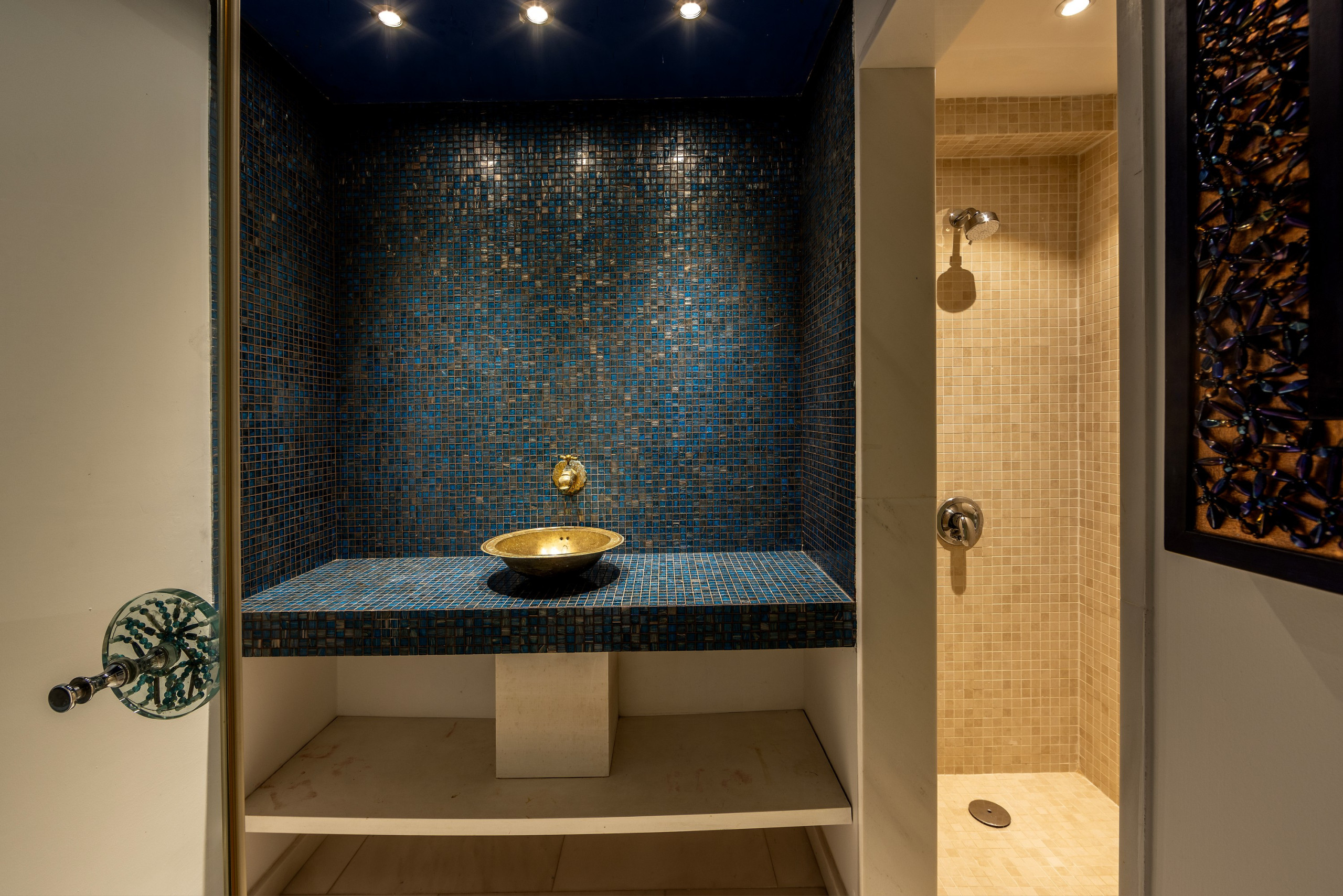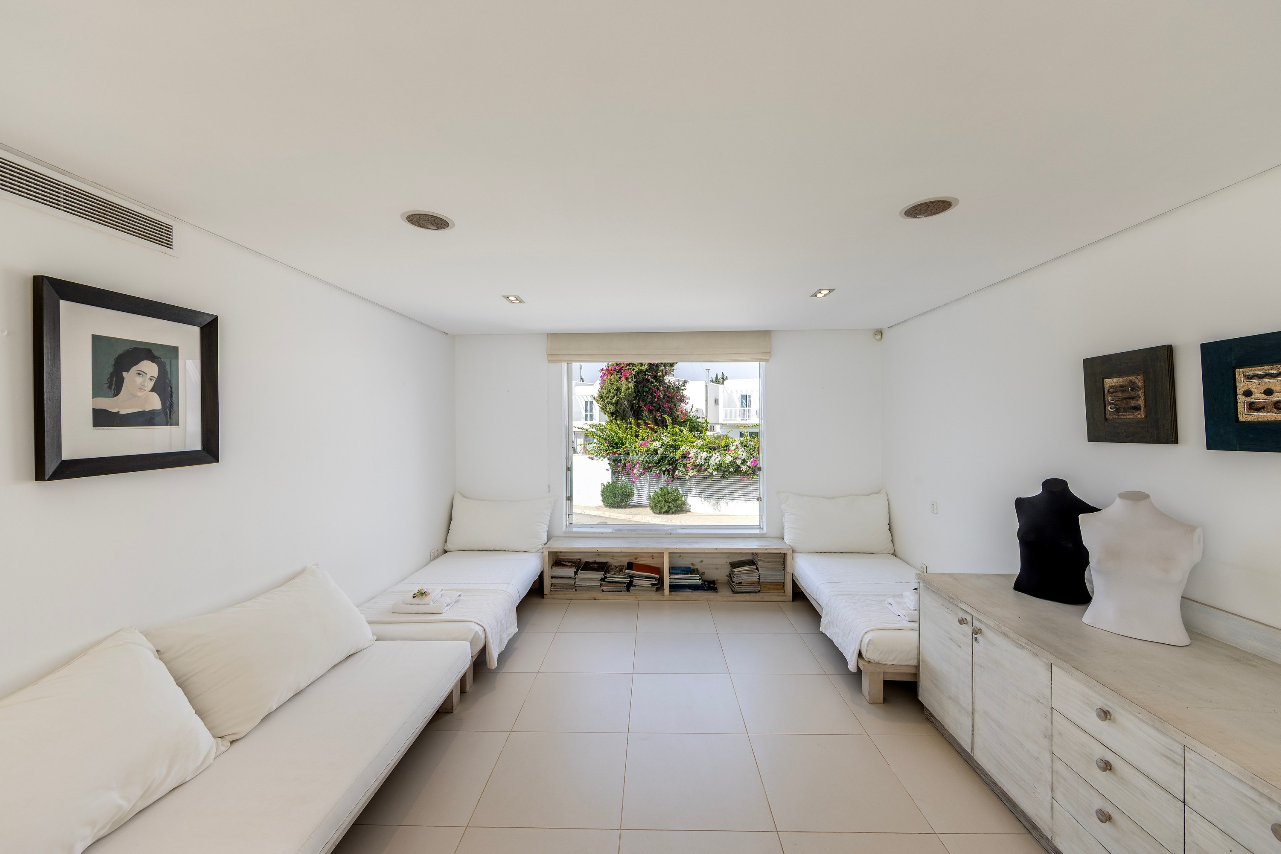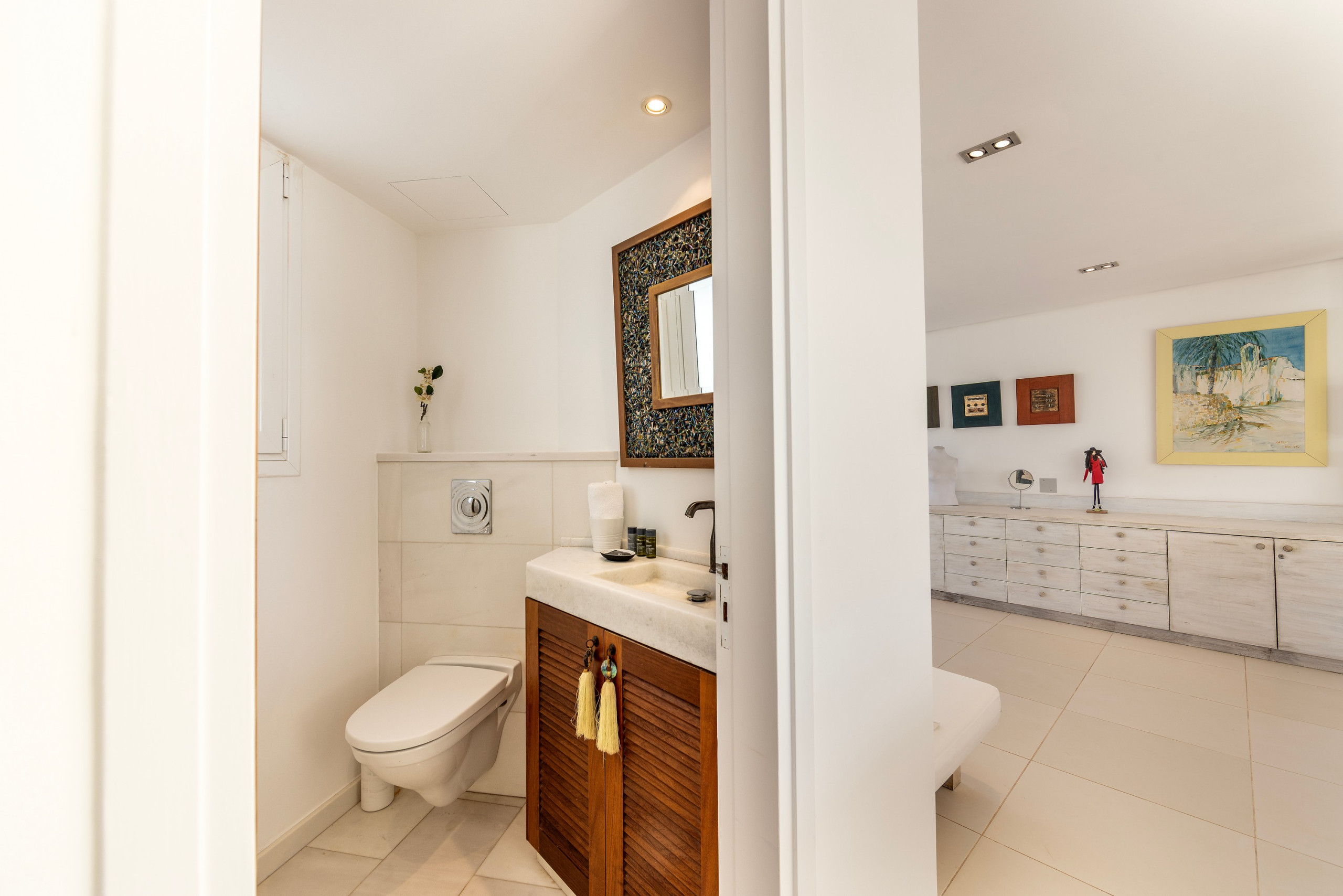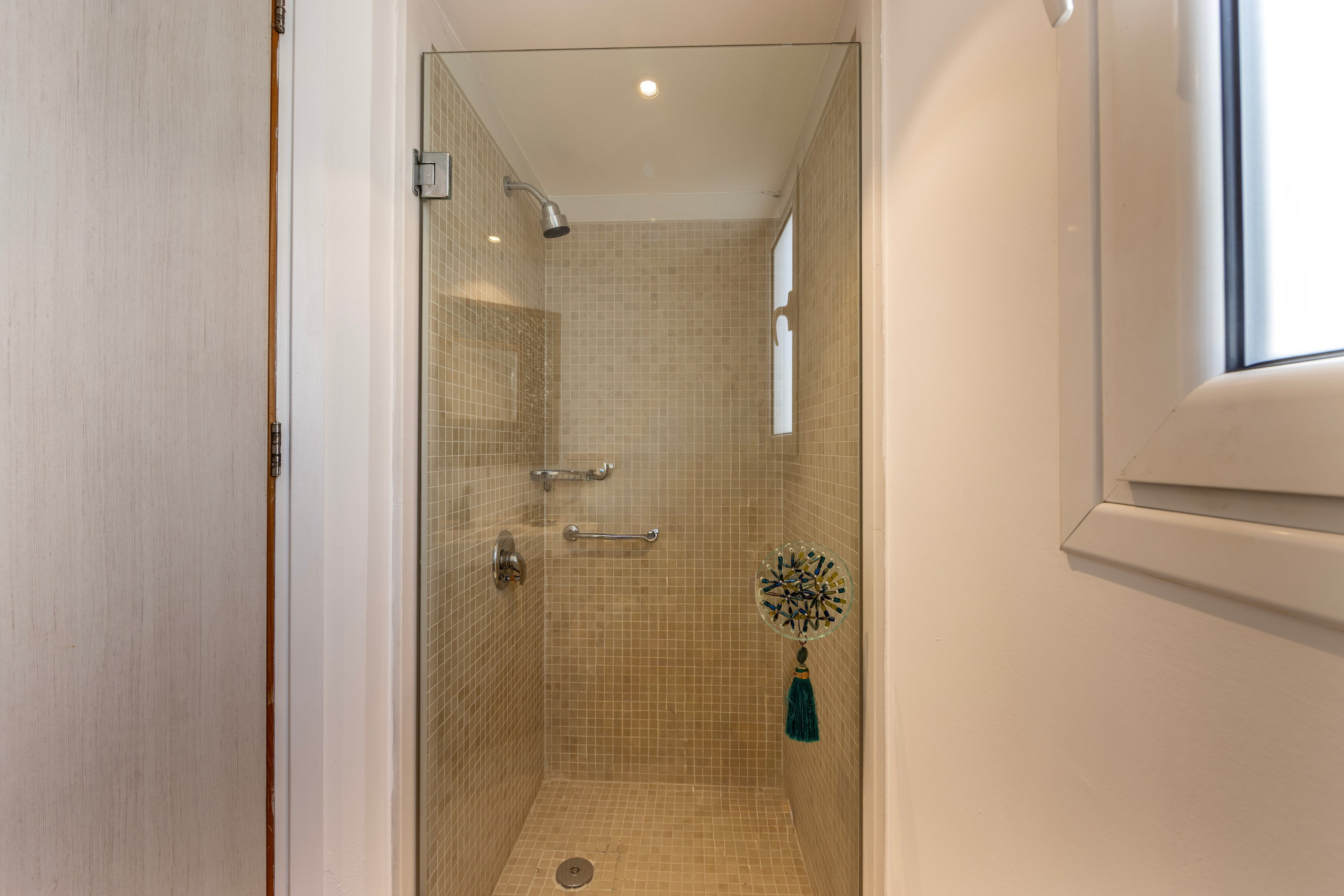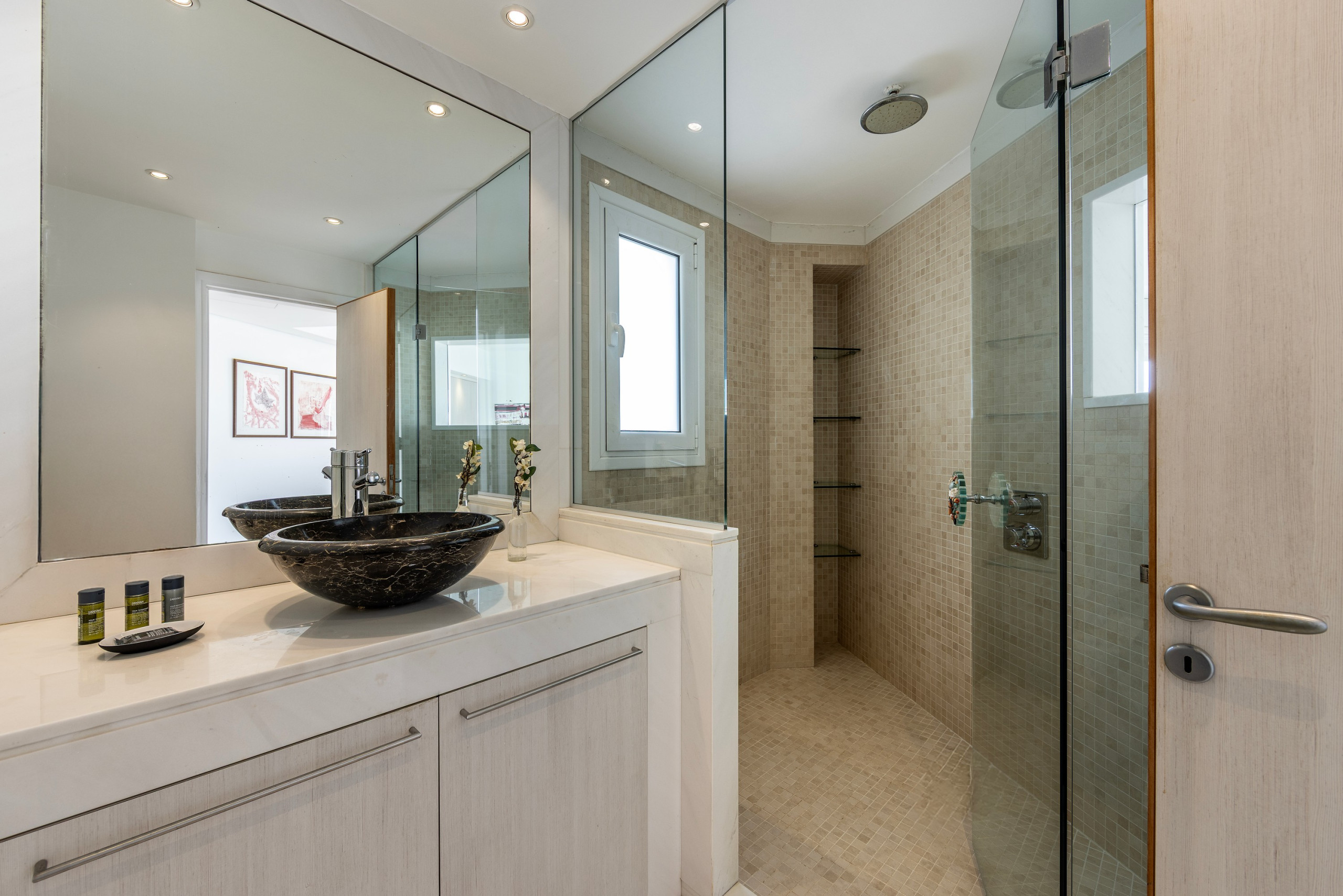The villa boasts five beautifully appointed bedrooms, featuring a mix of king-size and individual beds, ensuring comfortable sleeping arrangements for all guests as well as five bathrooms. Three en-suite bedrooms with king-size beds are located on the upper floor. The fourth bedroom, with two large single beds, is on middle floor. If you open the indoor shutters, this room also serves as a second seating room overlooking the ground floor living room. The spacious basement floor serves as the fifth bedroom with a king-size bed, TV lounge, shower room and steam bath.