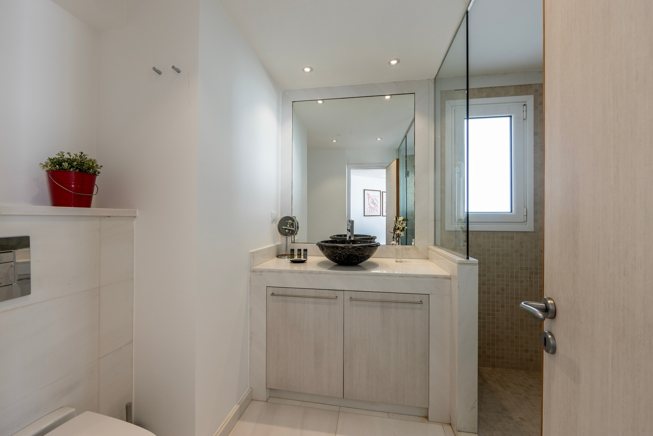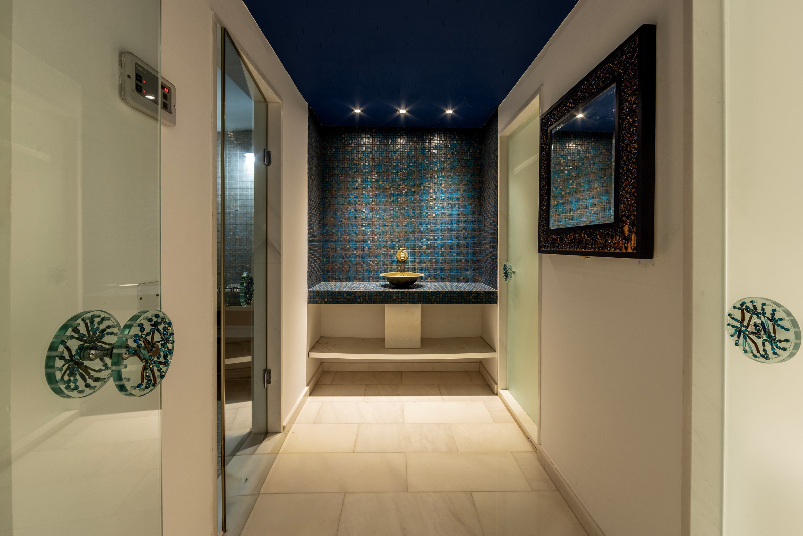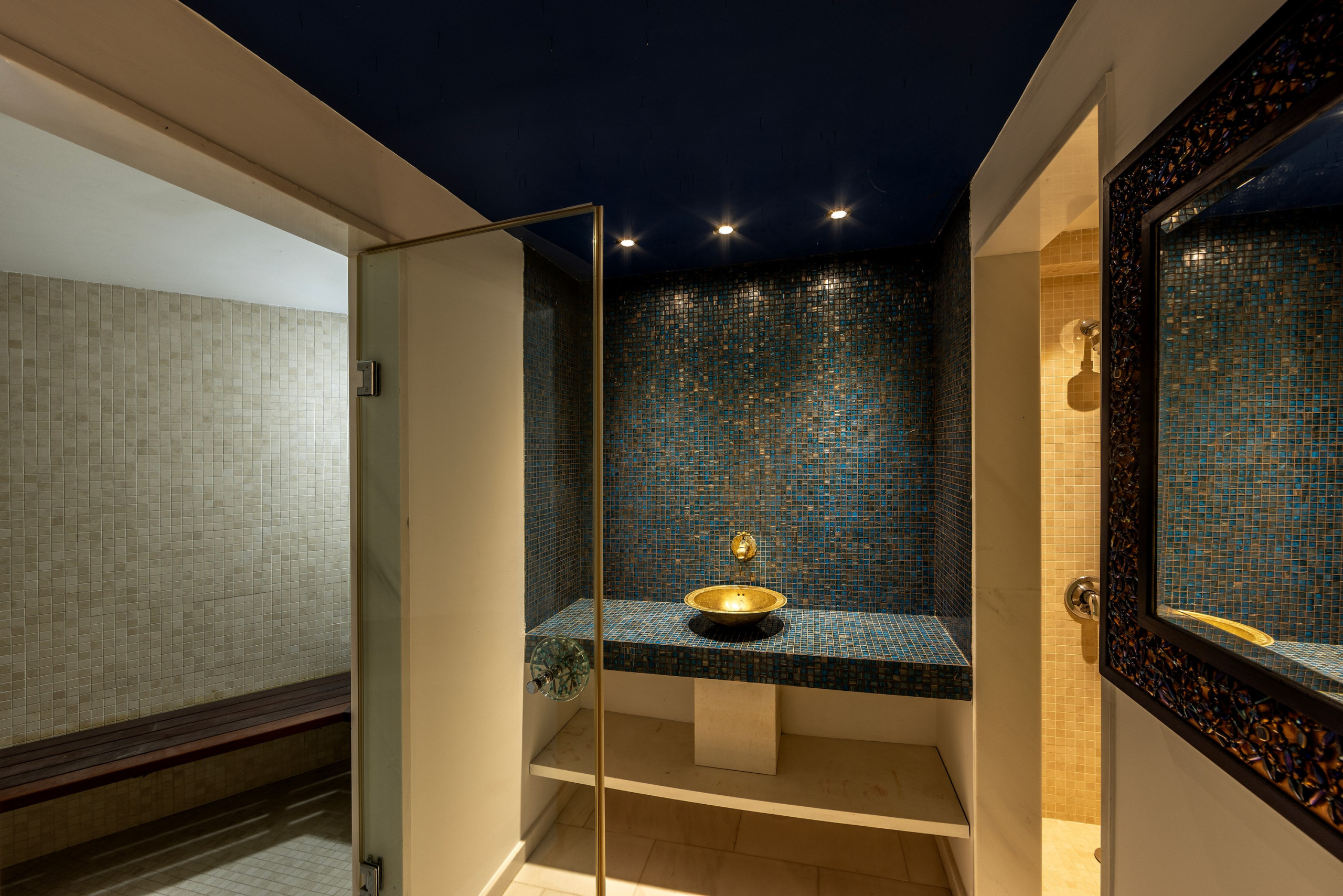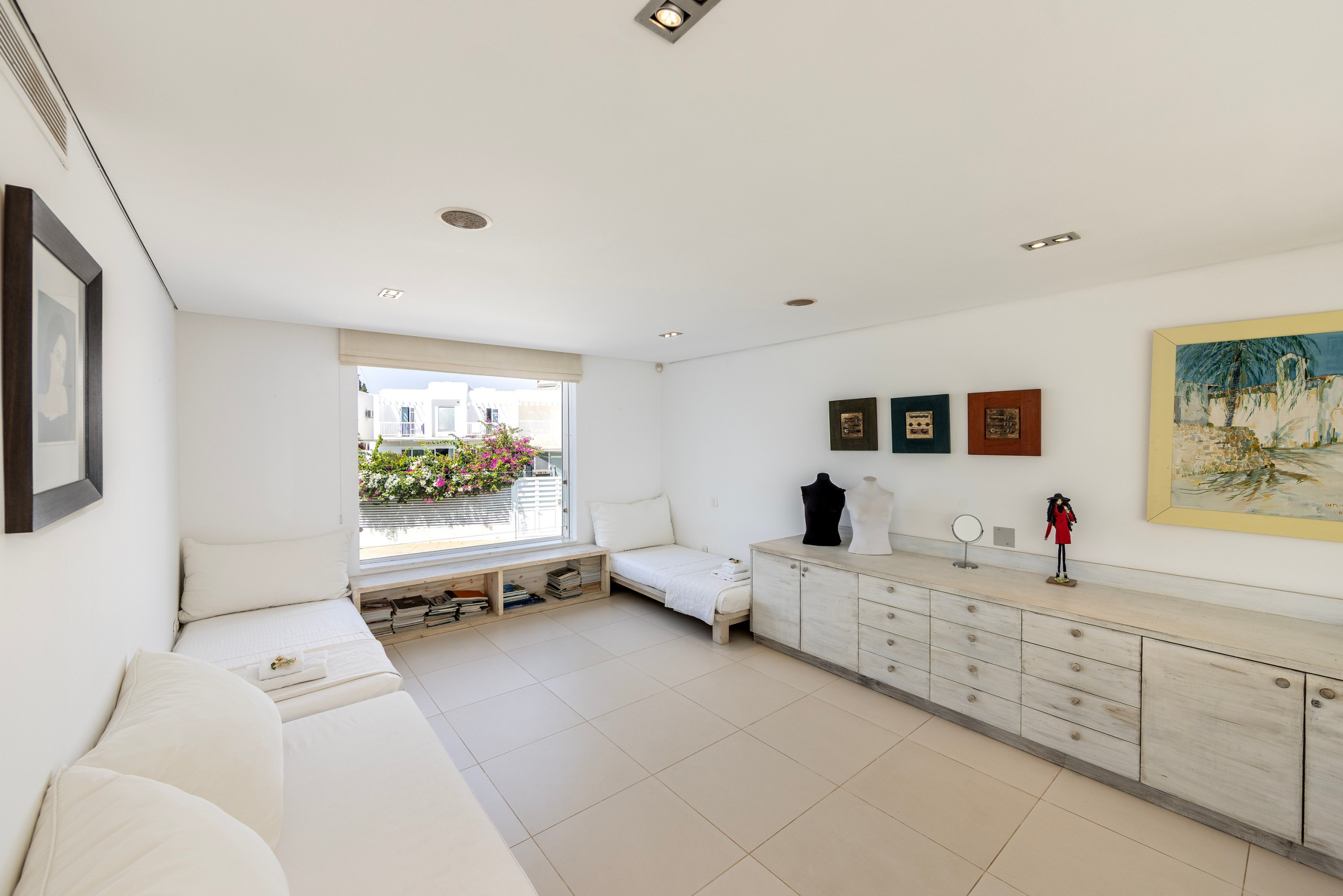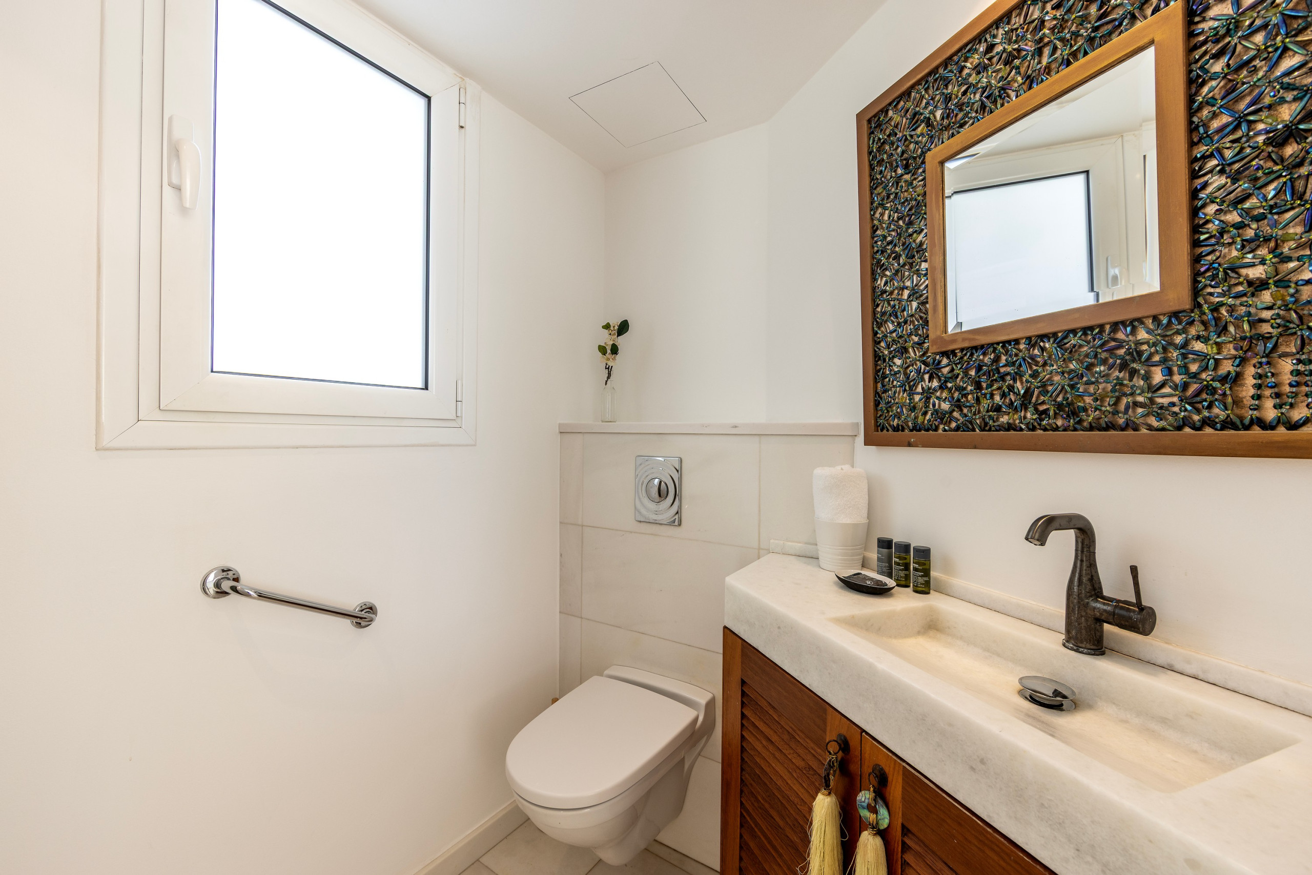 The villa boasts five beautifully appointed bedrooms, featuring a mix of king-size and individual beds, ensuring comfortable sleeping arrangements for all guests as well as five bathrooms. Three en-suite bedrooms with king-size beds are located on the upper floor. The fourth bedroom, with two large single beds, is on middle floor. If you open the indoor shutters, this room also serves as a second seating room overlooking the ground floor living room. The spacious basement floor serves as the fifth bedroom with a king-size bed, TV lounge, shower room and steam bath.