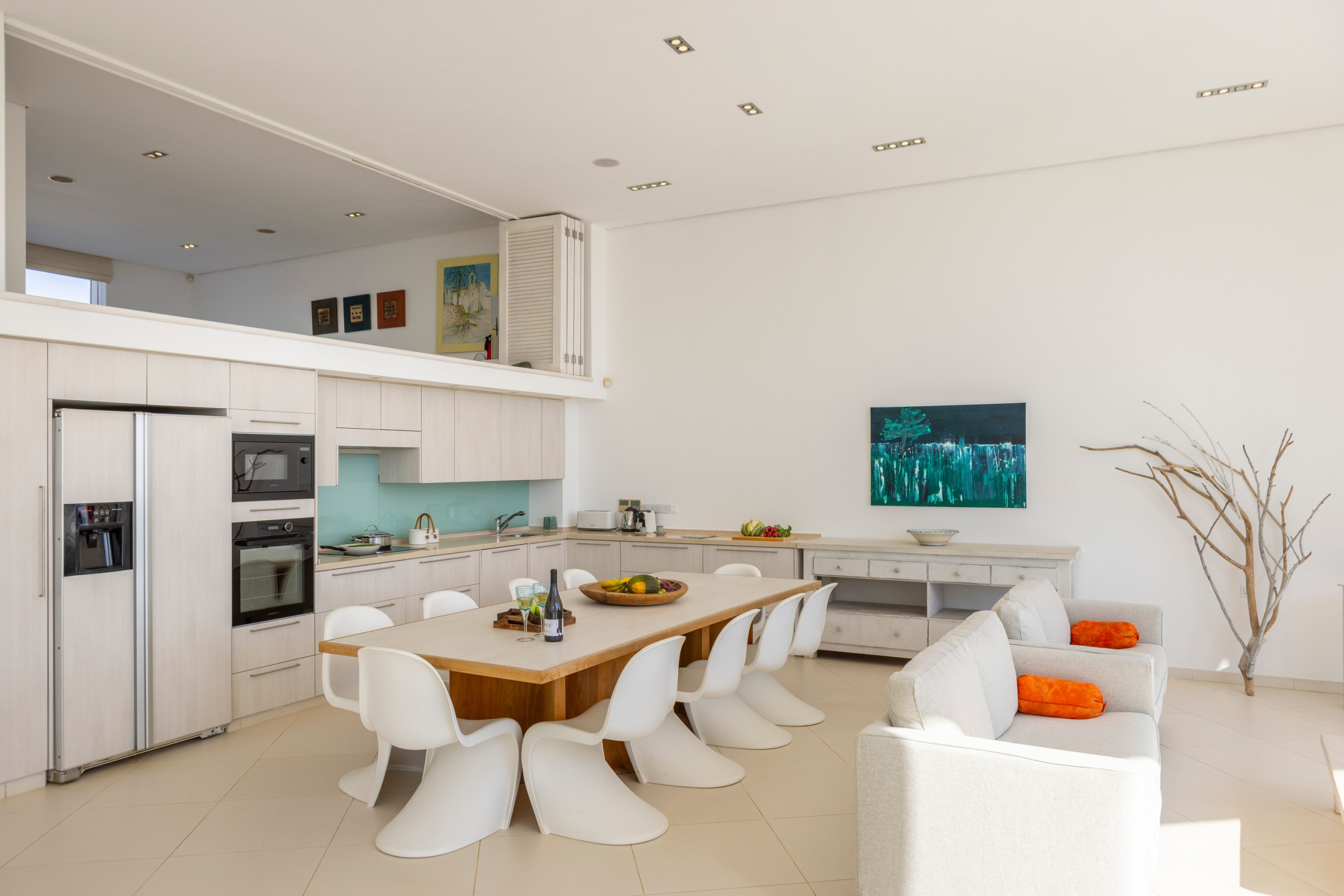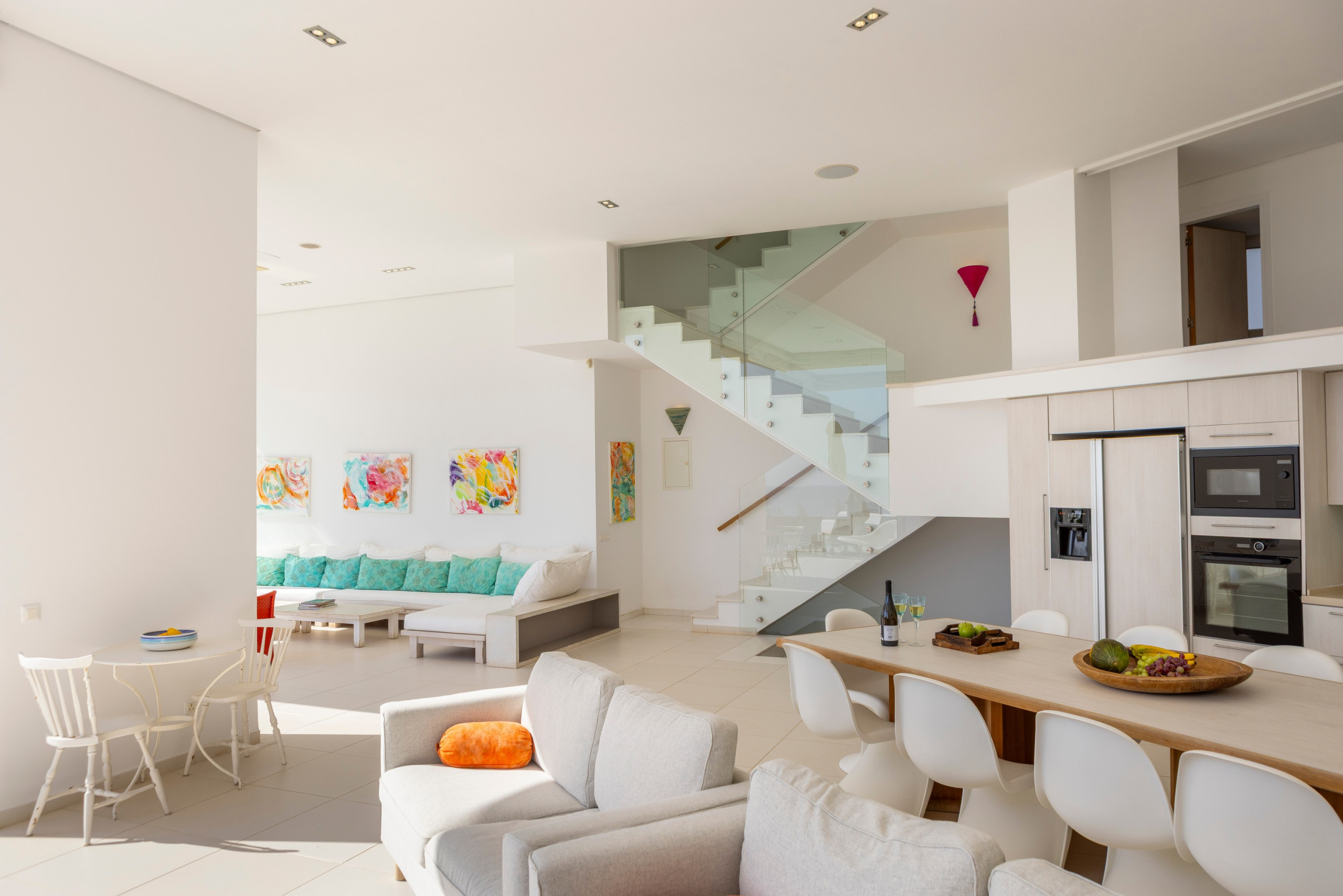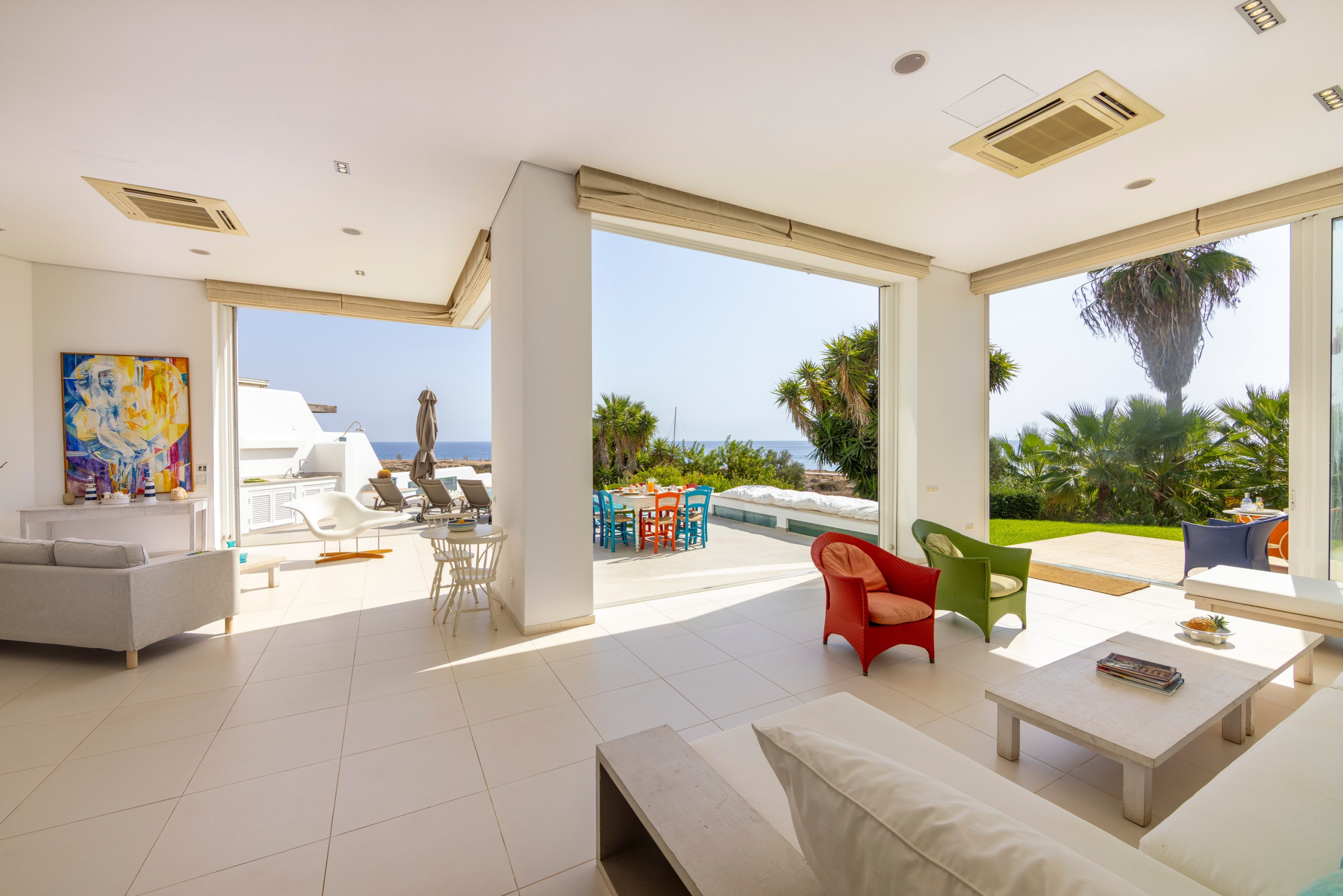 The heart of the villa is its ground floor living room and the open-plan fully equipped kitchen, featuring state-of-the-art appliances including a glass-ceramic hotplate, fridge, freezer, dishwasher, oven, microwave, coffee machine, and a comprehensive set of kitchenware and dishes. The large patio windows open wide to join interior with the pool patio and the garden.