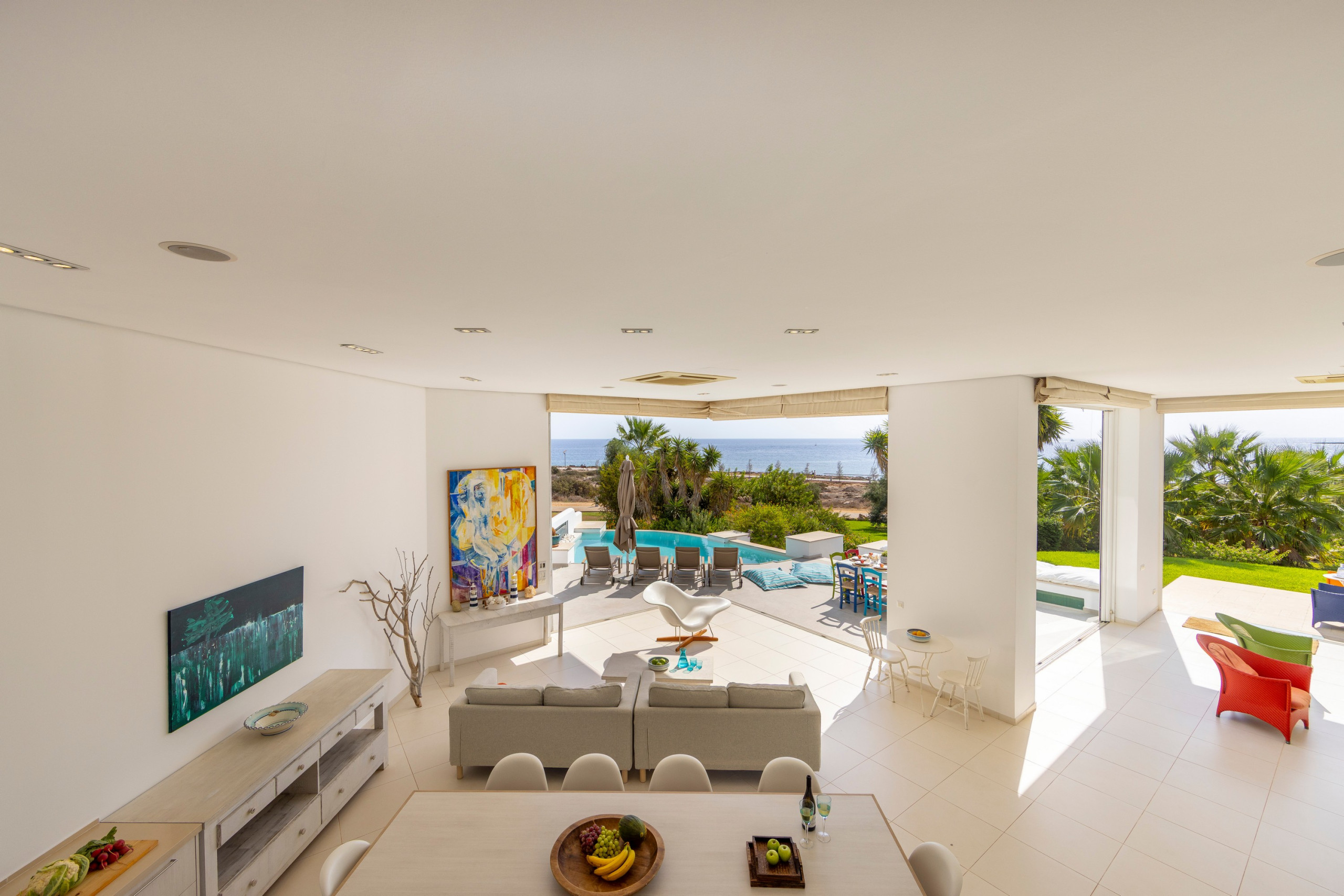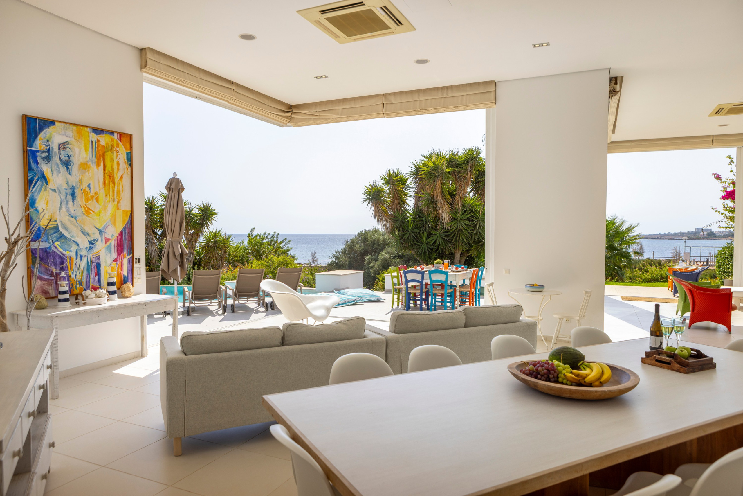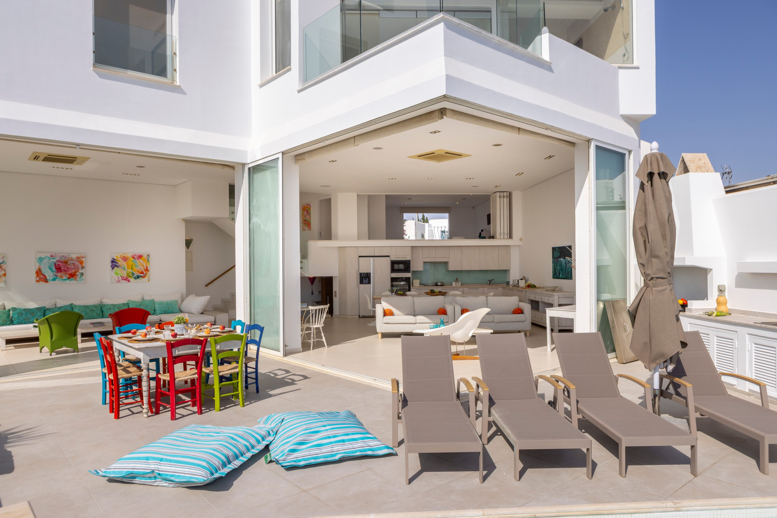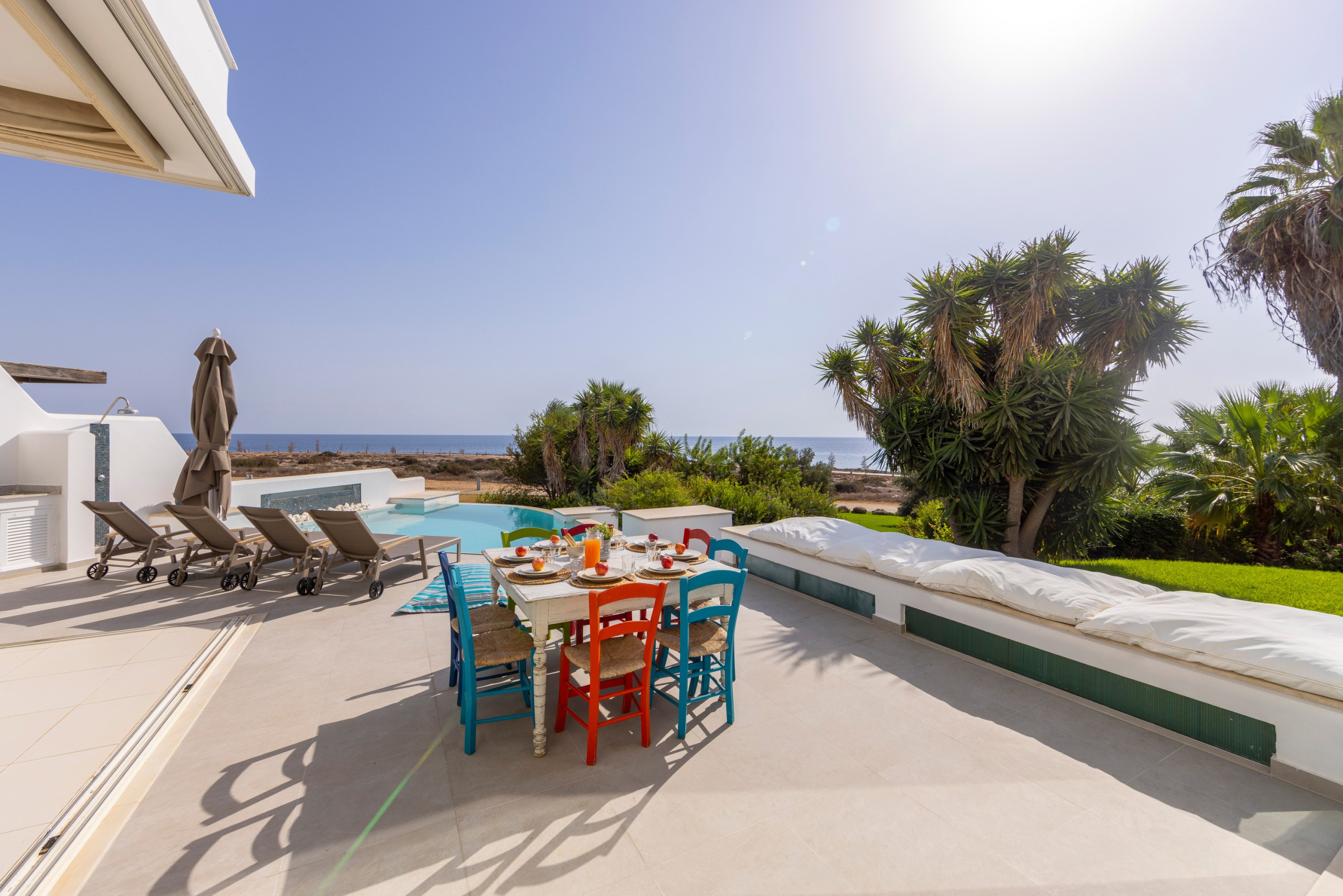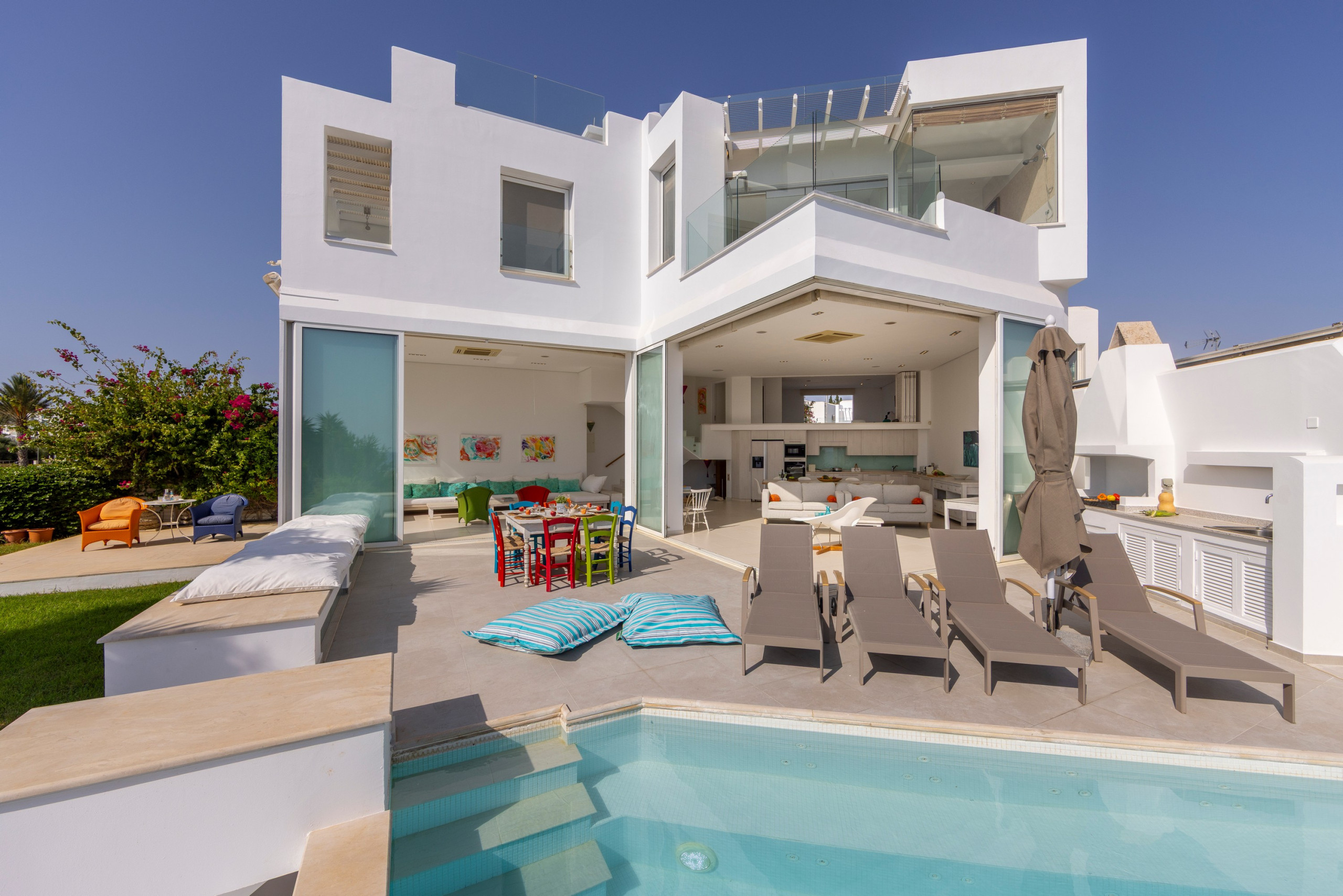 Protaras Seafront Villa AleMar is a stunning family-friendly property located in the best spot of the picturesque coastal town of Protaras, offering stunning sea views and quick access to the beach, an ideal setting for memorable holidays. This spacious 300 square metre villa comfortably accommodates up to 10 guests, making it perfect for families, friend groups, and special gatherings. The house was individually designed by one of Cyprus’s top architects and offers unique features, comfort and design.