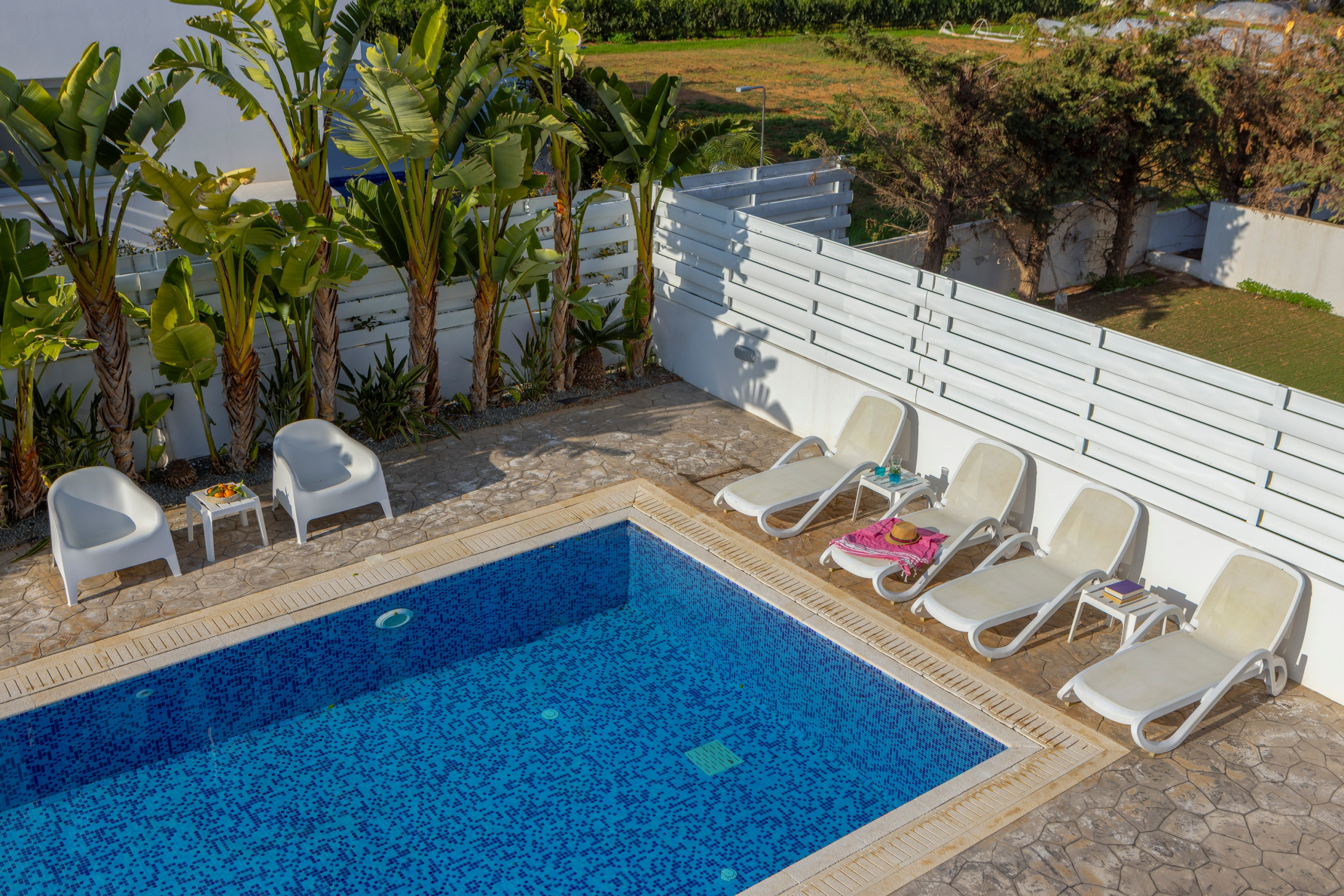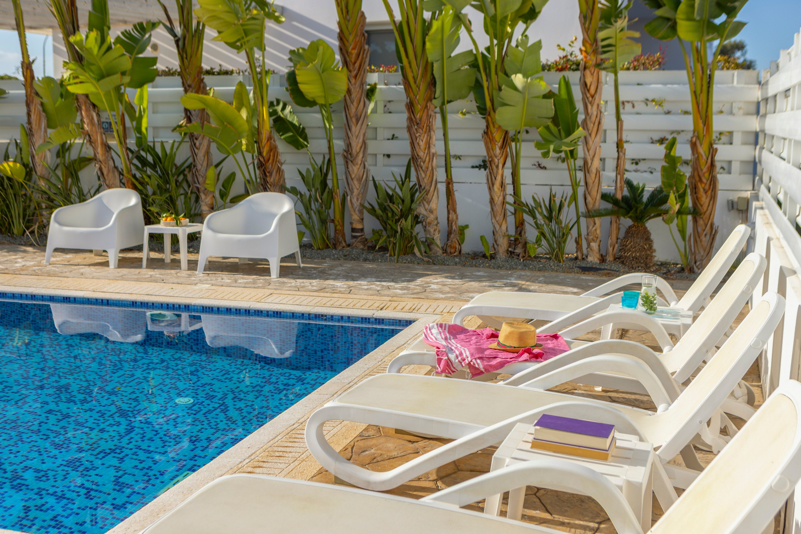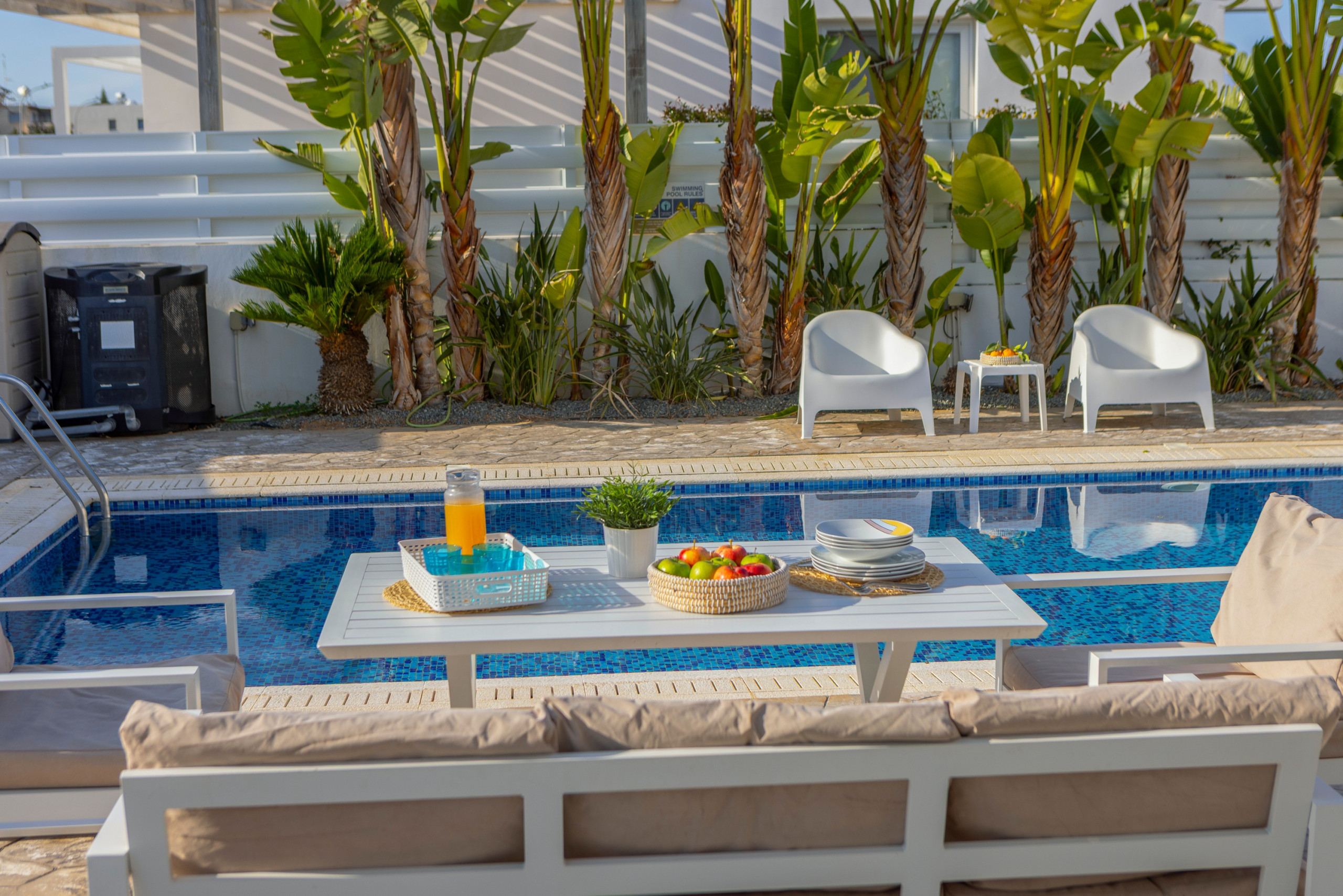 There is also a water park and aquarium that are worth a visit. The biggest water park in the Middle East can be found just outside of Ayia Napa which is only 10km away. Closer to the villa, less than three minutes’ drive away, is the more local town of Ayia Triada/Pernera, with its own 'strip of restaurants which are favored amongst the locals for their high quality. In this area you will find Golden Coast Fishing Harbor the romantic Sirina Bay or the child friendly Kalamies Beach.
