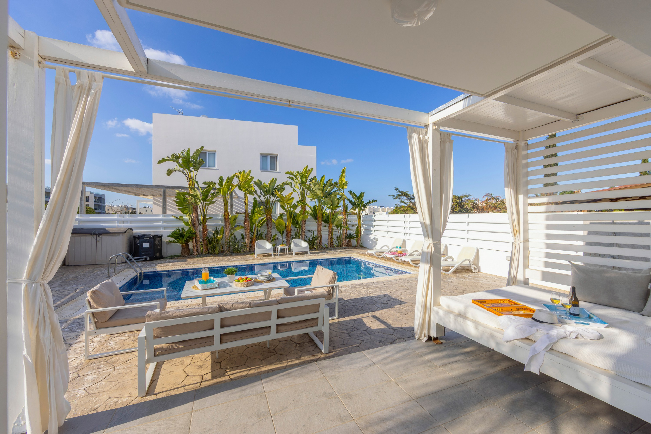 This superb retreat lies by the seashore of one of the islands best resorts, surrounded by lush gardens, just a few metres from the centre of Protaras, and only a metres away from the beach, restaurants, bars and shopping centre of Protaras.