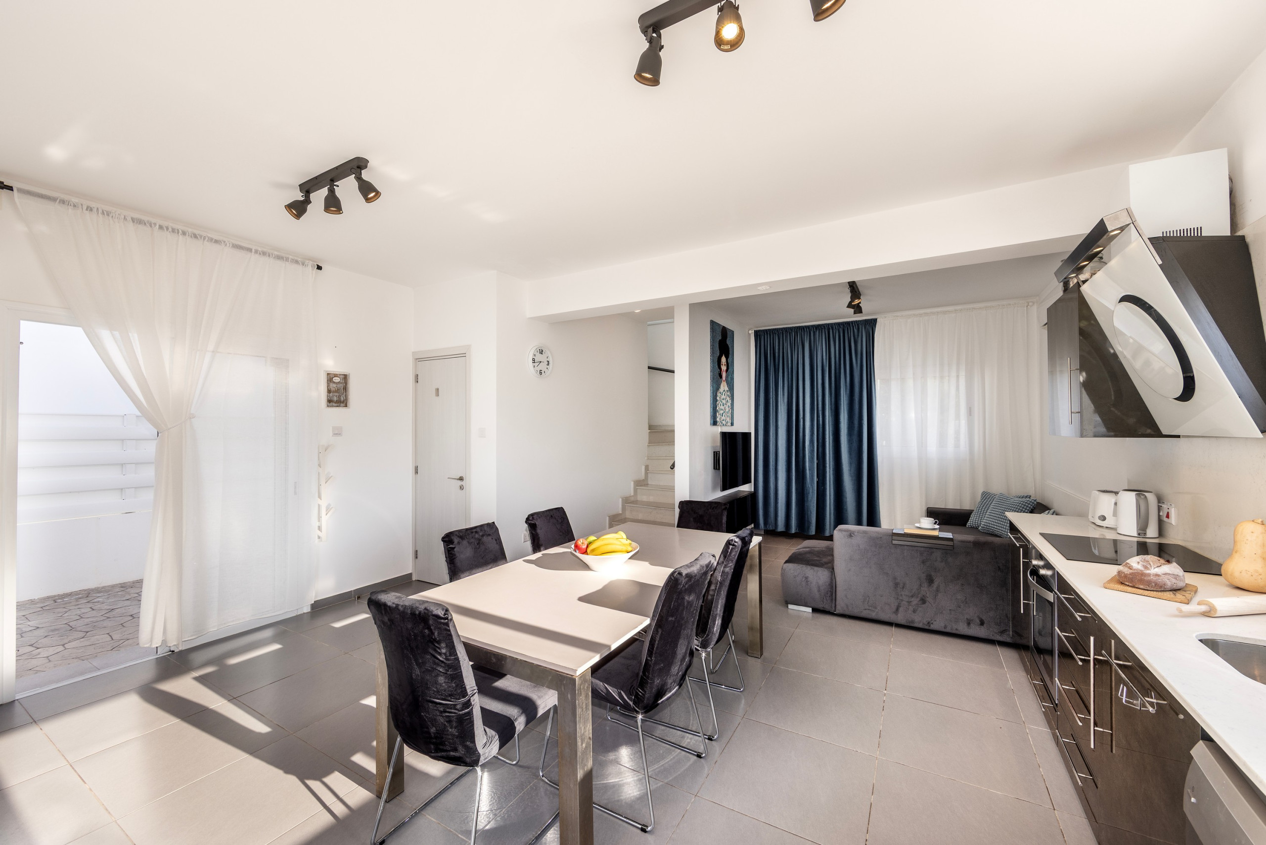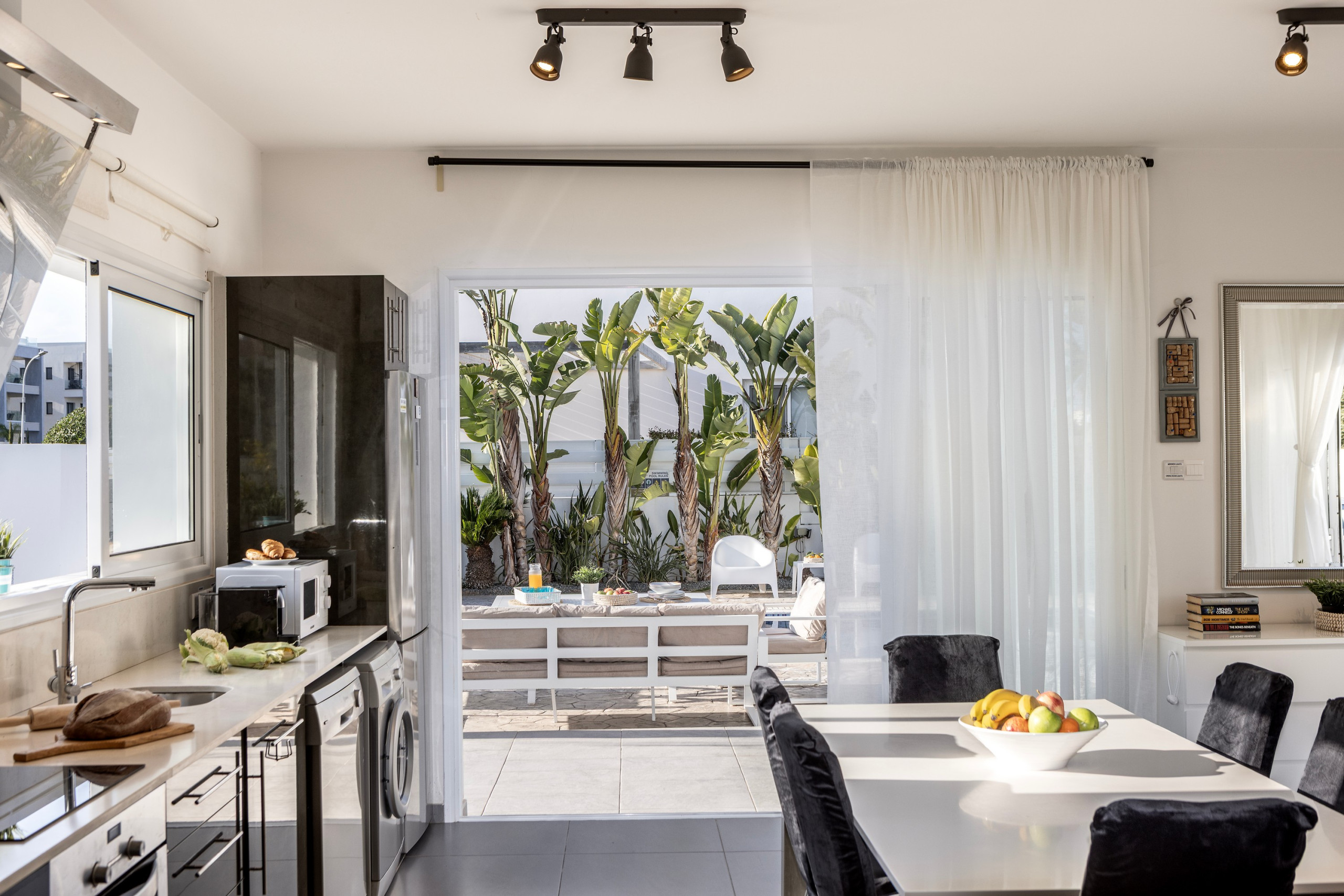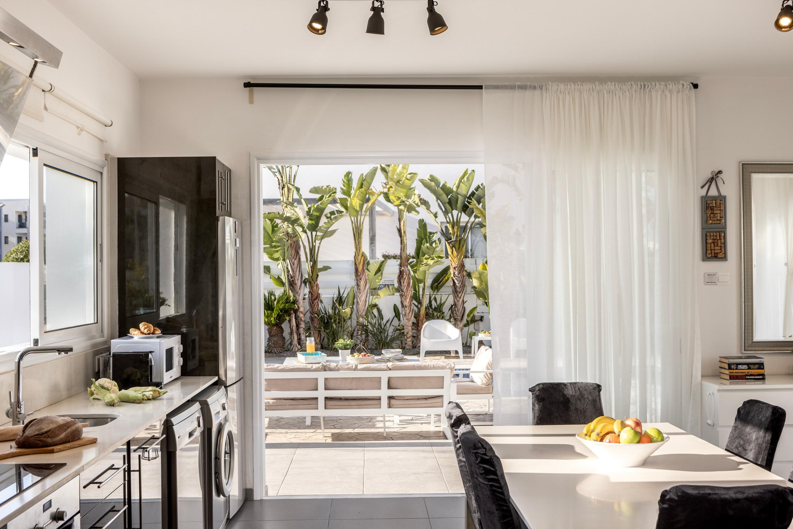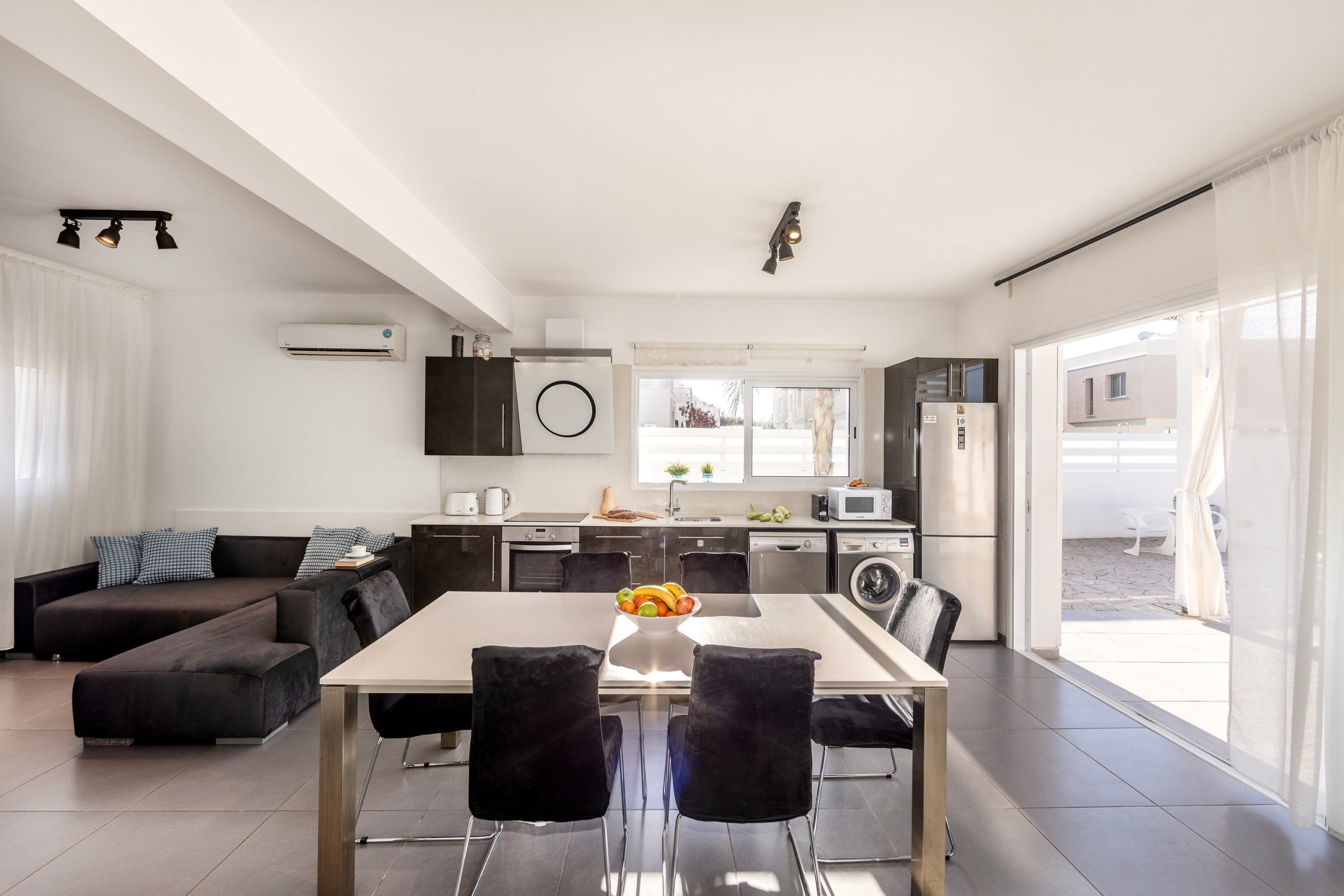 The modern American-style kitchen is fully equipped with everything needed for preparing delicious meals, including a glass-ceramic hotplate, fridge, freezer, oven, microwave, dishwasher, coffee machine, toaster, kettle, and a complete set of kitchenware and dishes. Guests will appreciate the convenience of a washing machine and WiFi throughout the property.