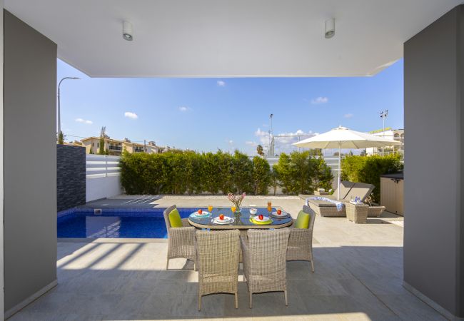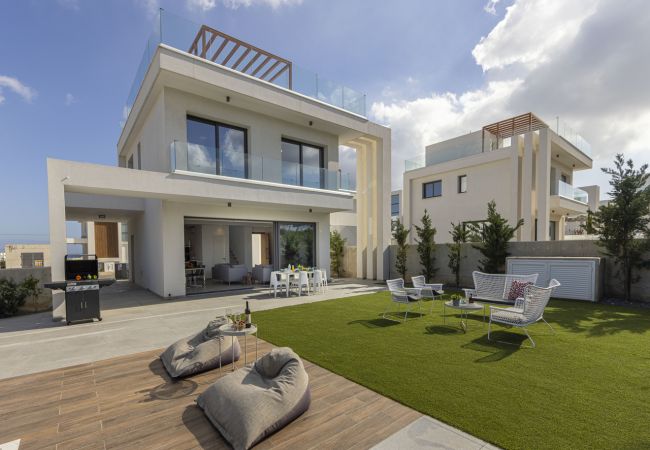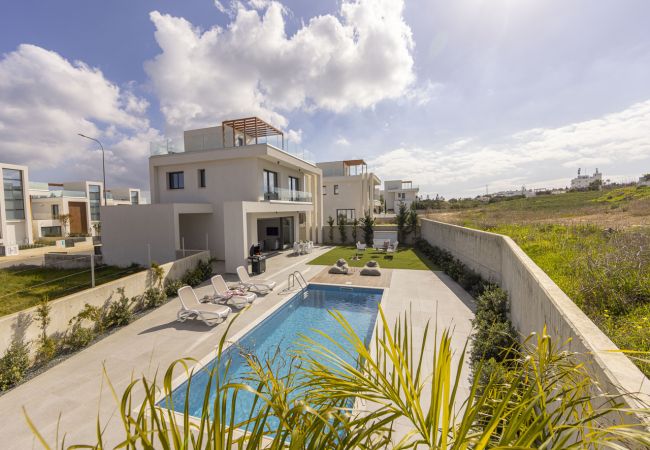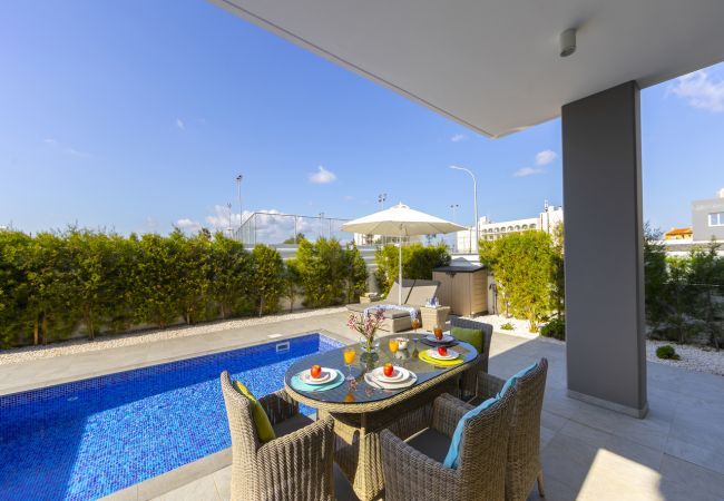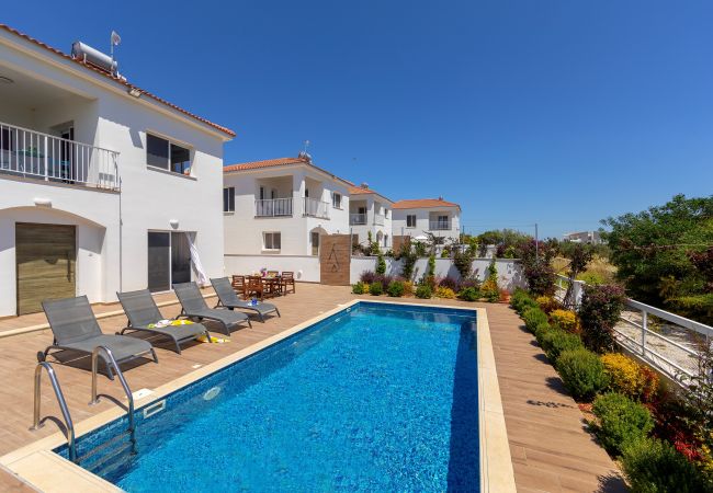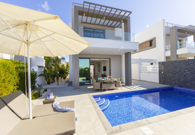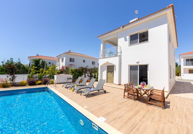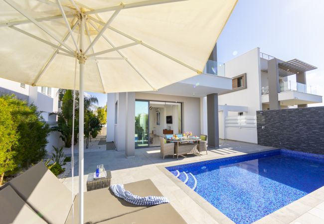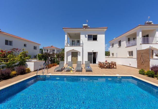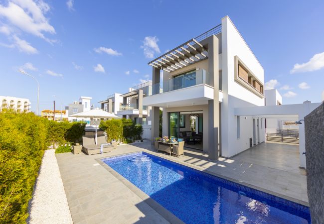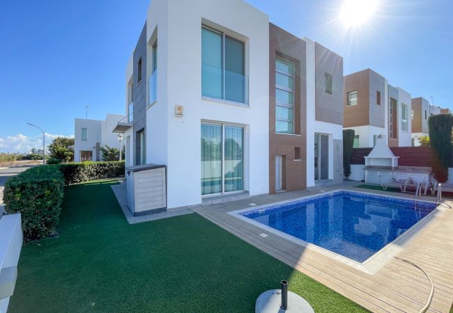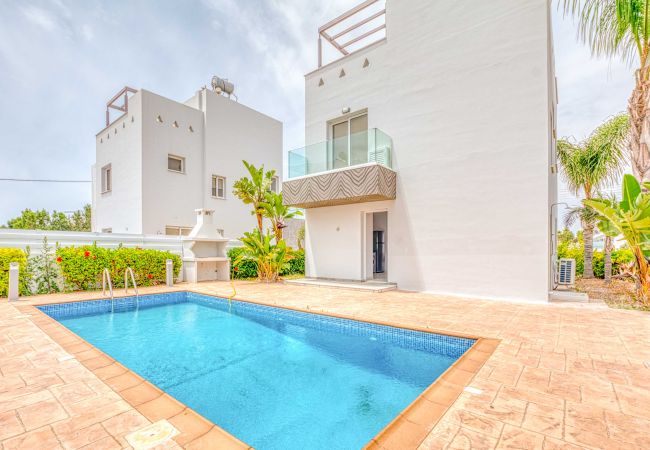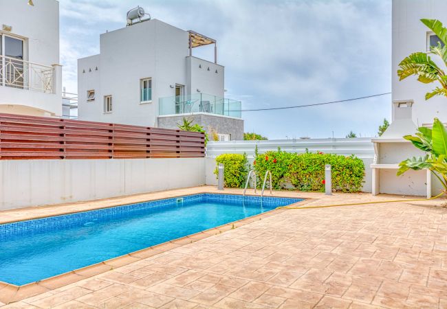 The villa in Protaras has 3 bedrooms. The villa is 142 m². The accommodation is equipped with the following items: garden, garden furniture, fenced garden, terrace, private swimming pool,...