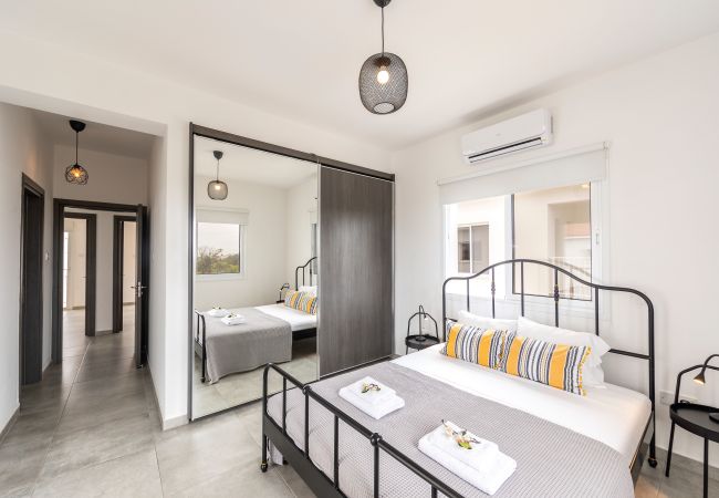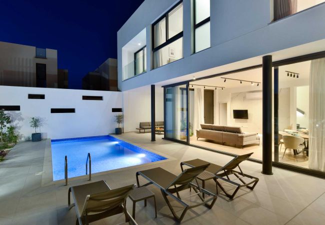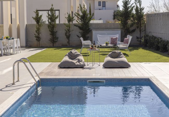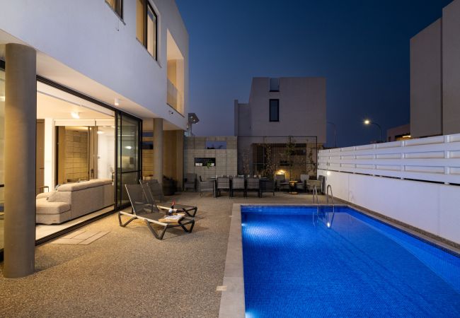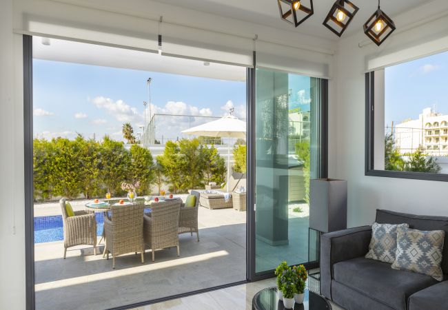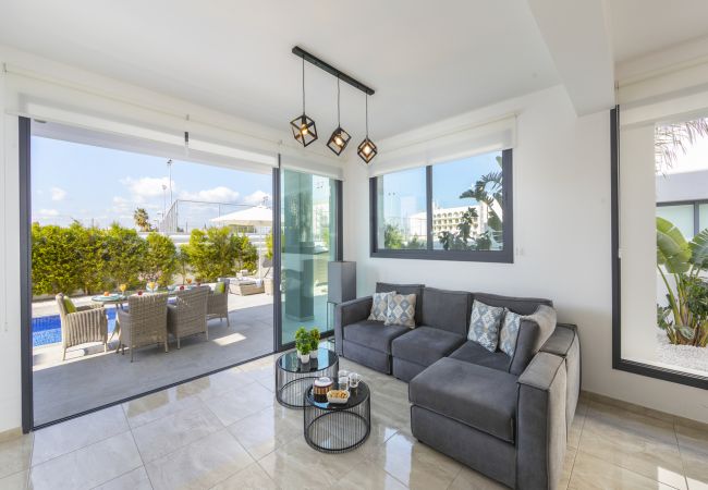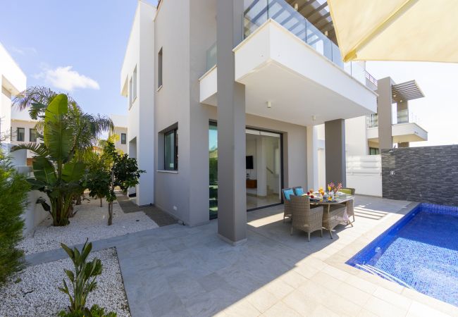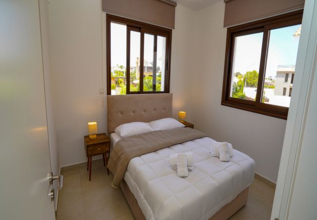 The villa in Ayia Napa has 3 bedrooms. The villa is 121 m². The accommodation is equipped with the following items: washing machine, air-conditioned, private swimming pool, covered parking...